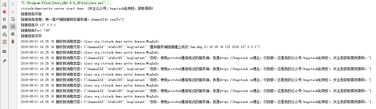 2019-08-04 16:25:48 接收到消息内容:{"channelId":"e0a8c2f0","msgContent":"你好,使用protobuf通信格式的服务端,我是https://bugstack.cn博主,付政委。这是我的公众号<bugstack虫洞栈>,关注我获取案例源码。"}