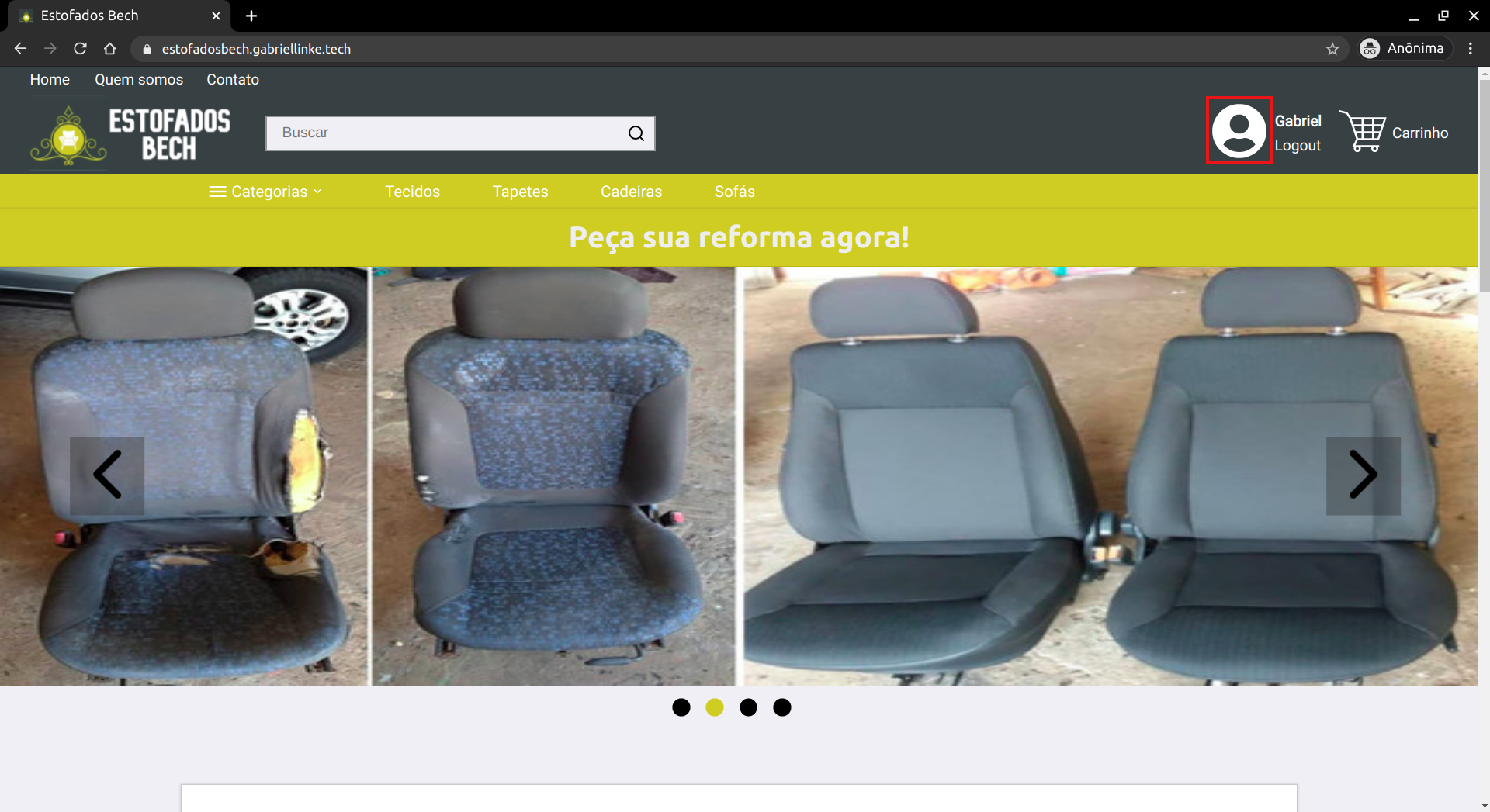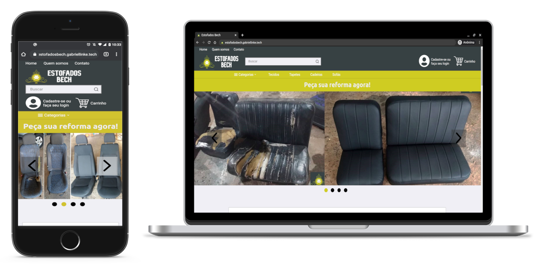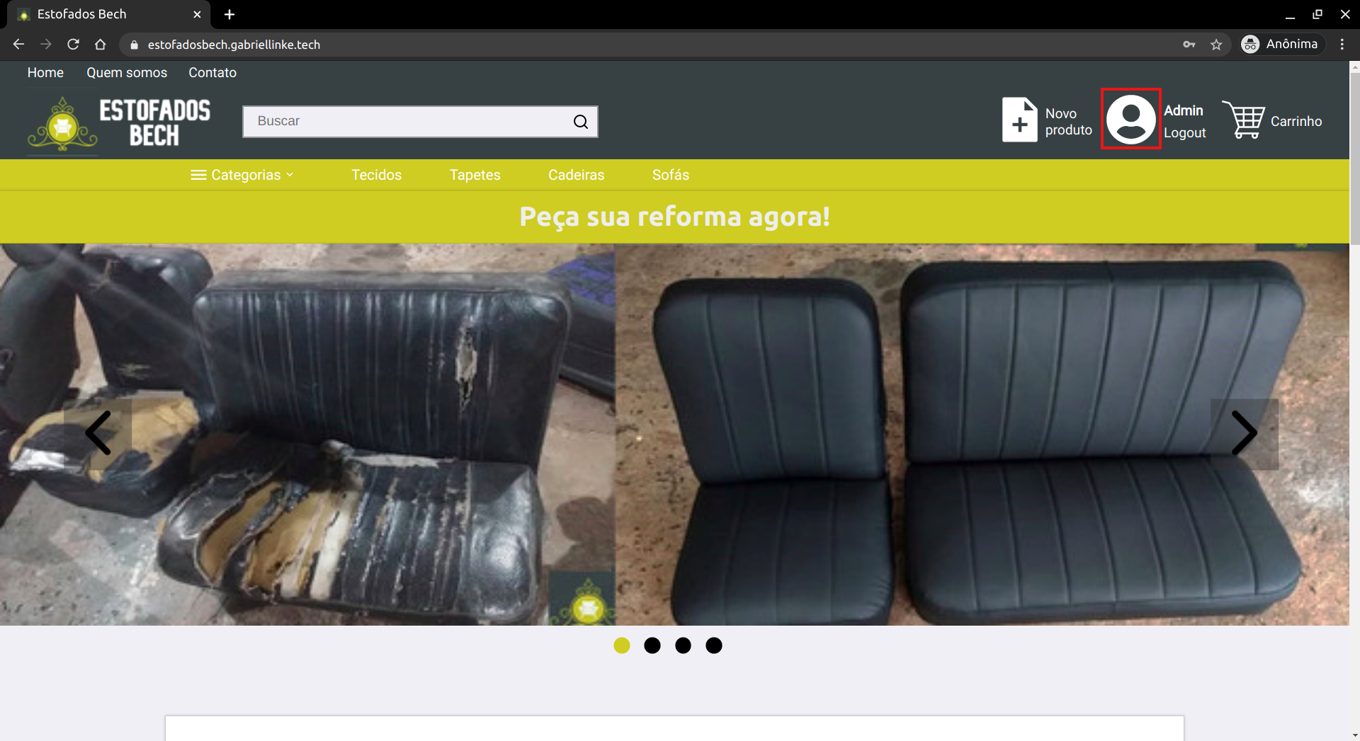 Atualmente o website tem uma versão de demonstração, com o seu back-end hospedado no Heroku e o front-end hospedado na Netlify. Para testar essa versão basta acessar o site https://estofadosbech.gabriellinke.dev.br. Para ter acesso a uma conta com permissões de administrador, entre em contato com o desenvolvedor. Uma explicação sobre o funcionamento pode ser encontrada a seguir.