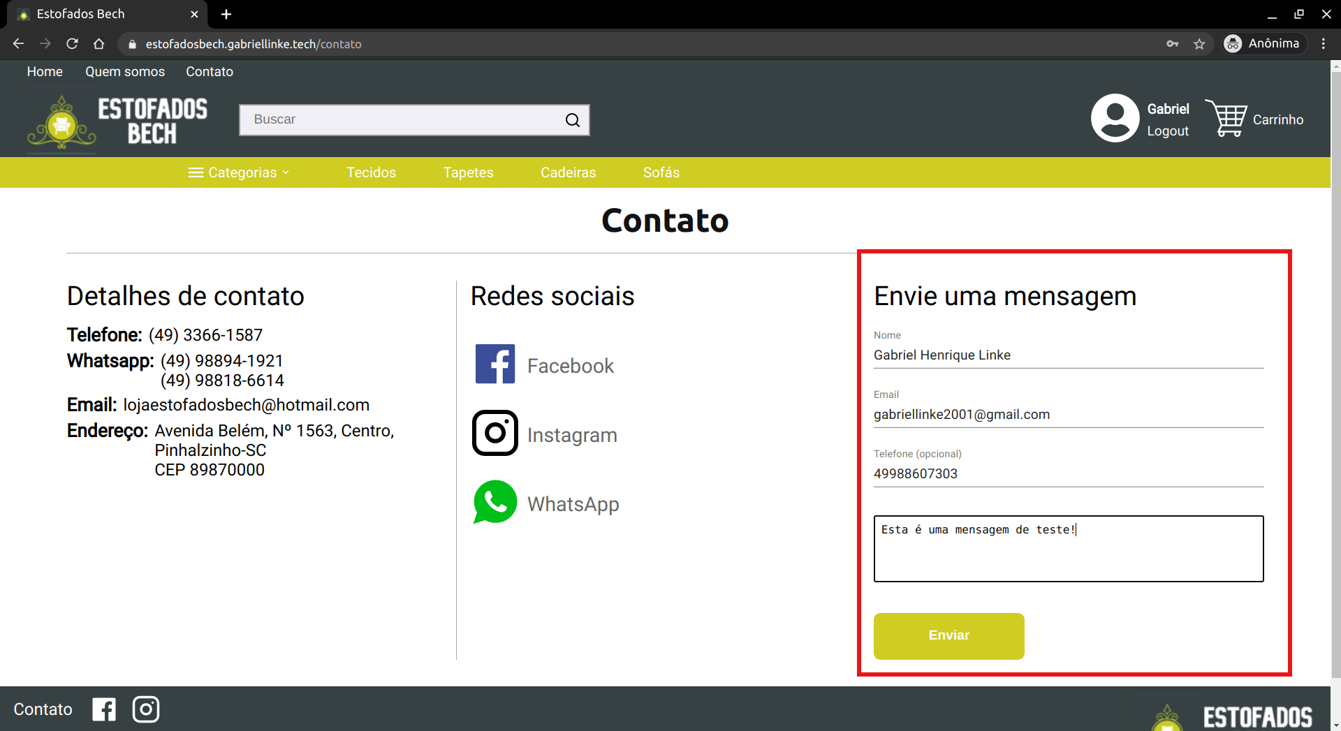 Para facilitar o contato do usuário com a loja, a página de contato dispõe de um formulário para envio de mensagens. Assim, o usuário pode mandar uma mensagem para a loja sem precisar sair do website. Para isso, basta preencher o seu nome, um email para onde pode ser enviada uma resposta, opcionalmente um telefone para contato e a mensagem em si.