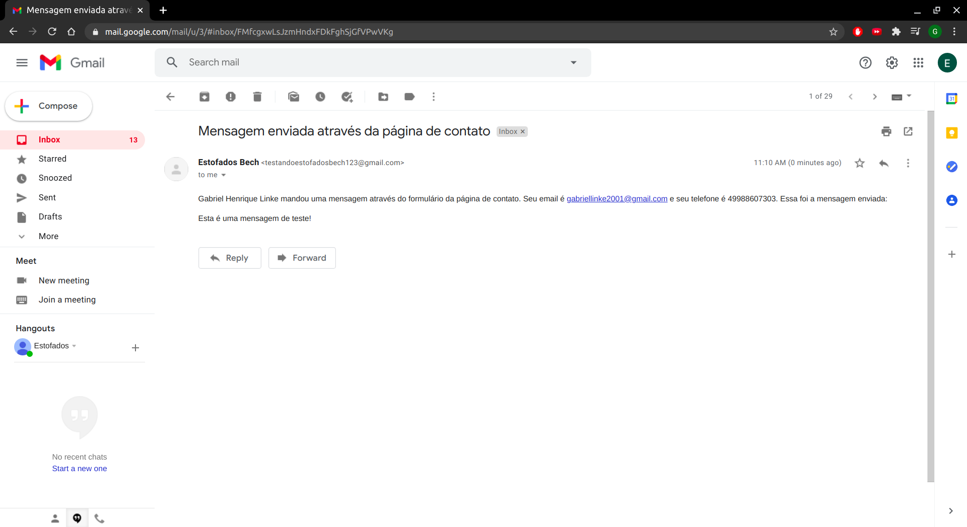 Figura 12: Demonstração de como a mensagem é recebida no email do administrador.