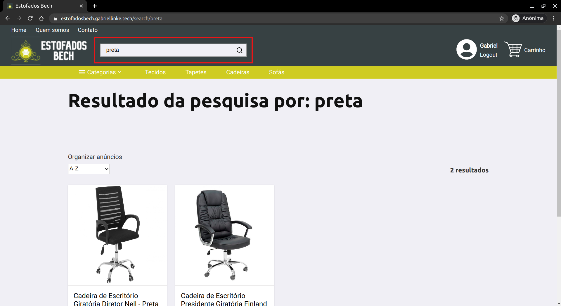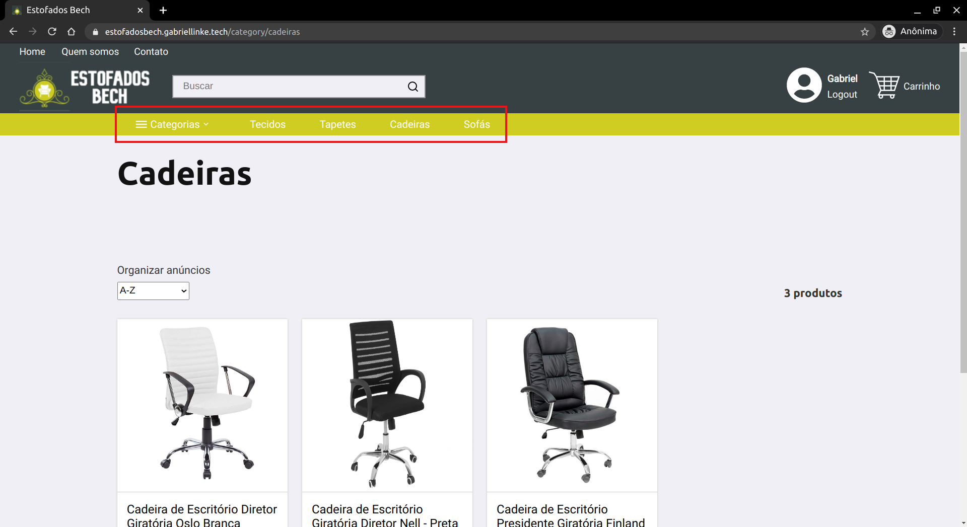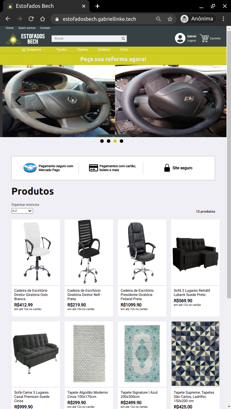 A próxima navegação é em procura dos produtos, e ela começa na Home page. Ao entrar na Home page é possível observar imagens de reformas de estofados feitas pela Estofados Bech. O usuário pode pedir uma reforma entrando em contato com a loja. Abaixo das imagens de reformas, podem ser encontrados todos os produtos cadastrados no website. Estes podem ser ordenados por ordem alfabética ou por ordem de preço.