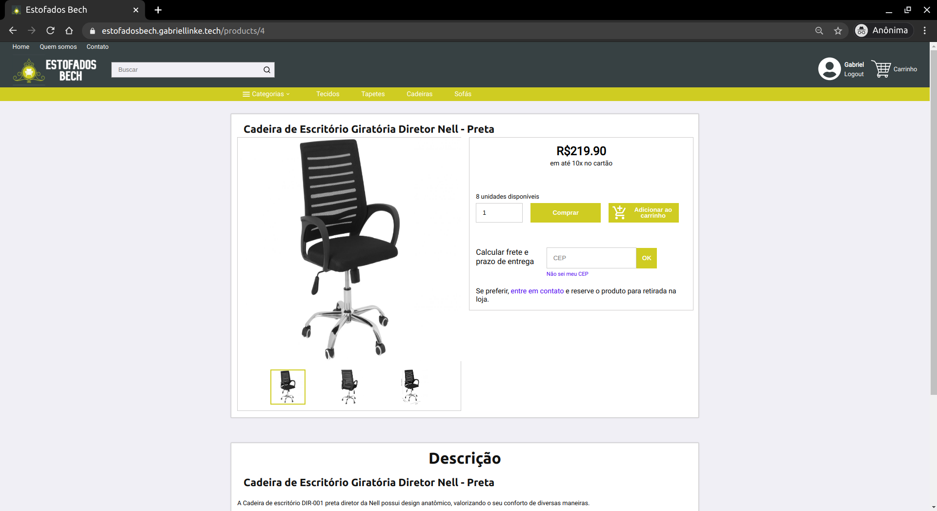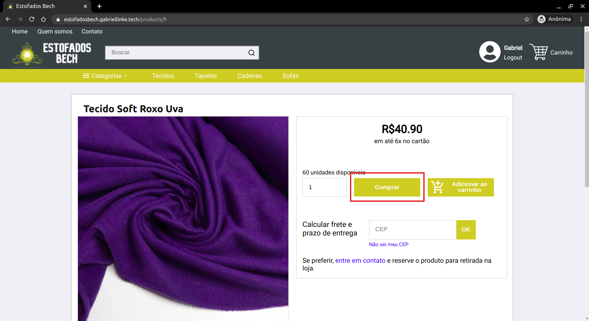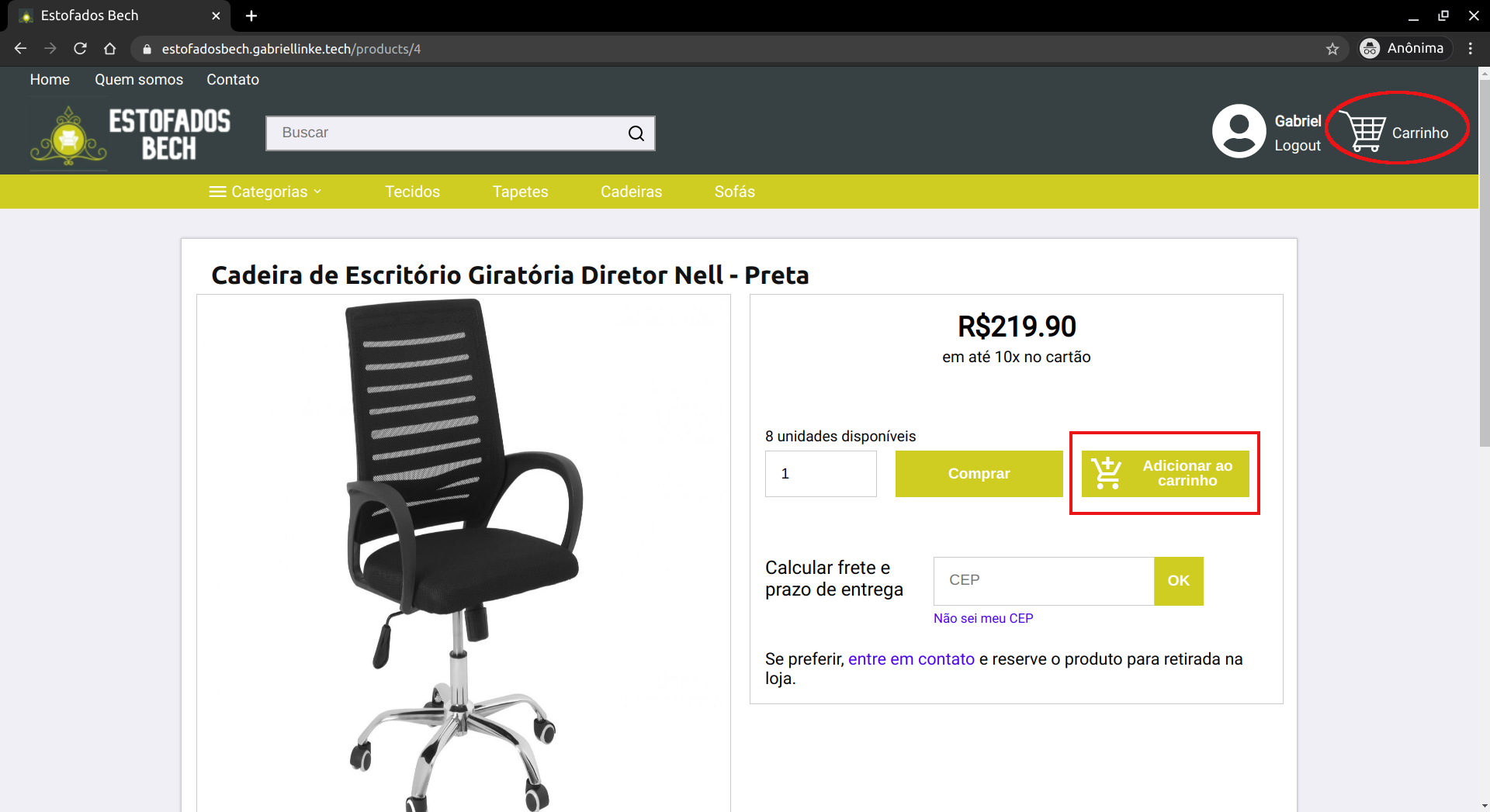 Para isso, o usuário primeiramente precisa clicar sobre o produto em que ele está interessado. Então, se abrirá a página de informações do produto. Nela o usuário pode visualizar todas as fotos do produto, a descrição do produto, e quantas unidades estão no estoque. Nessa página também há uma área onde o usuário pode inserir seu CEP e calcular o preço do frete daquele produto. Além disso, também estão presentes nessa página os botões para adicionar o produto ao carrinho e de continuar a compra.