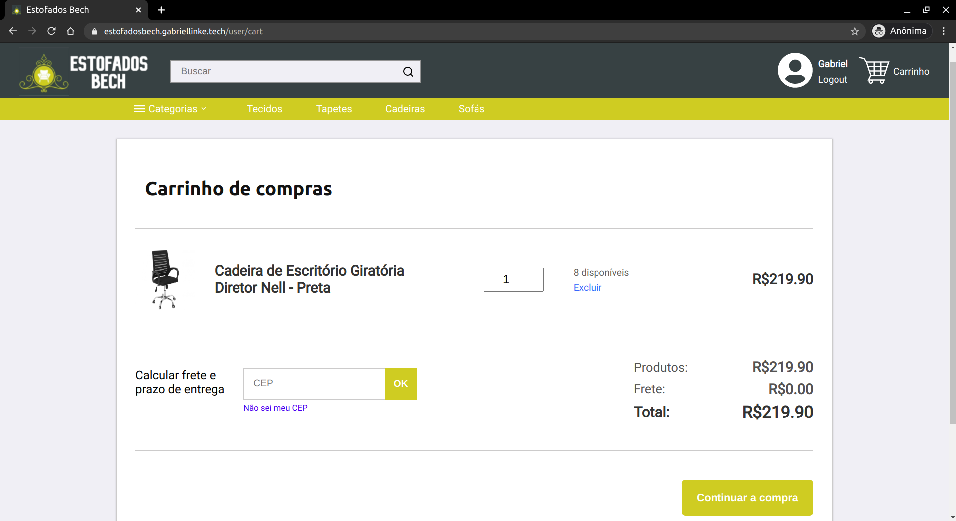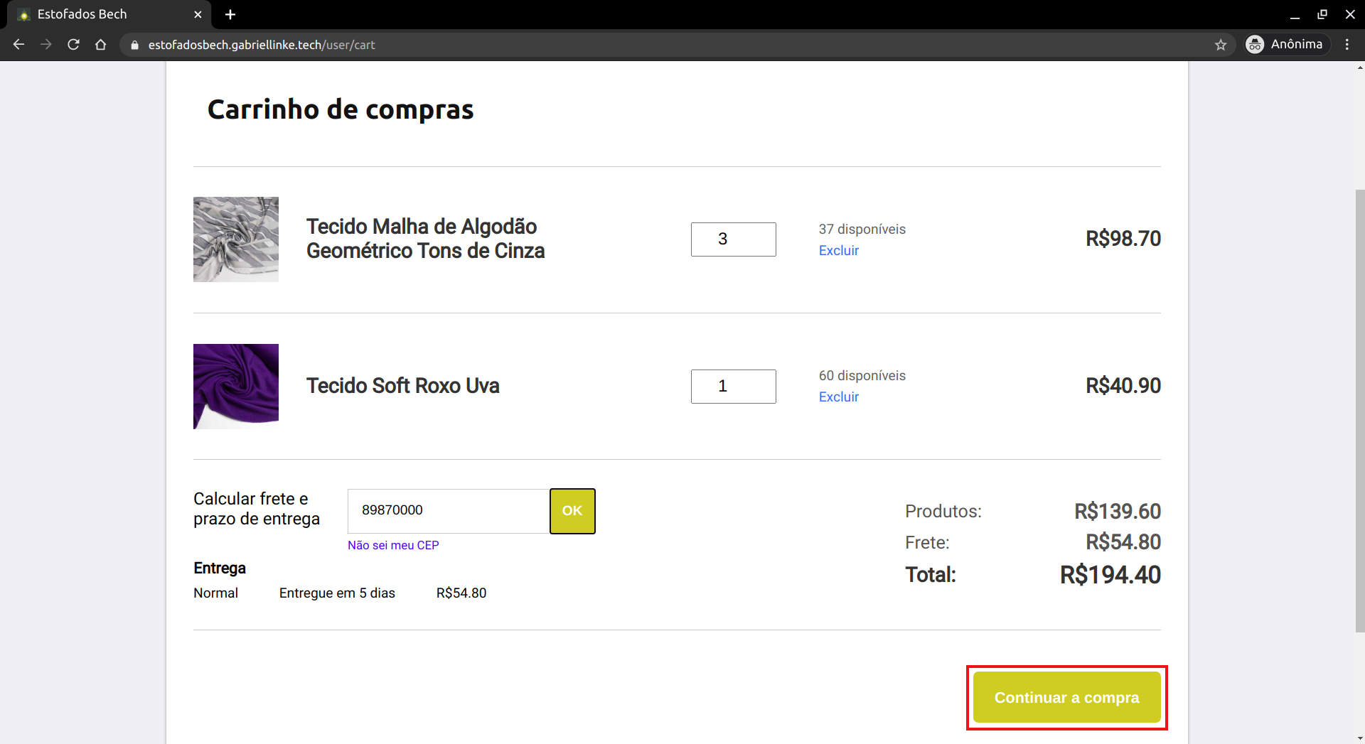 Após definir os produtos que serão comprados, está na hora de fazer o pedido. É possível comprar apenas um produto, clicando em "Comprar" na página do produto. Porém, se o usuário quiser comprar mais de um produto, basta adicionar todos eles ao carrinho, e clicar em "Continuar a compra".