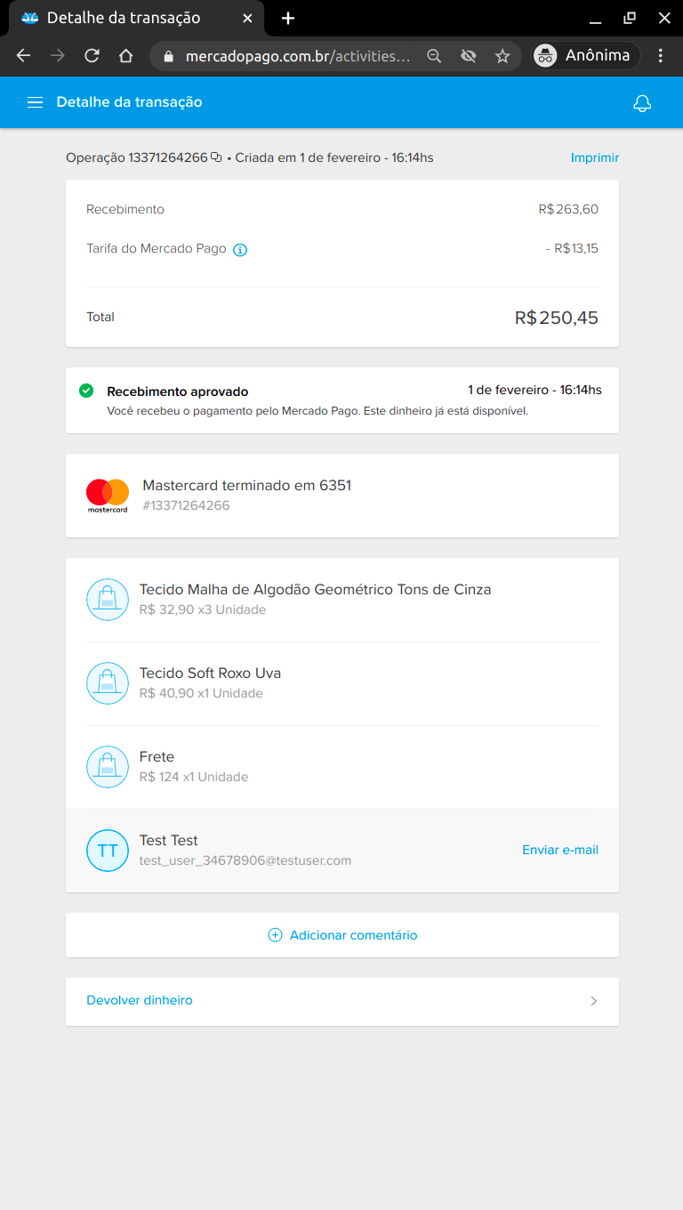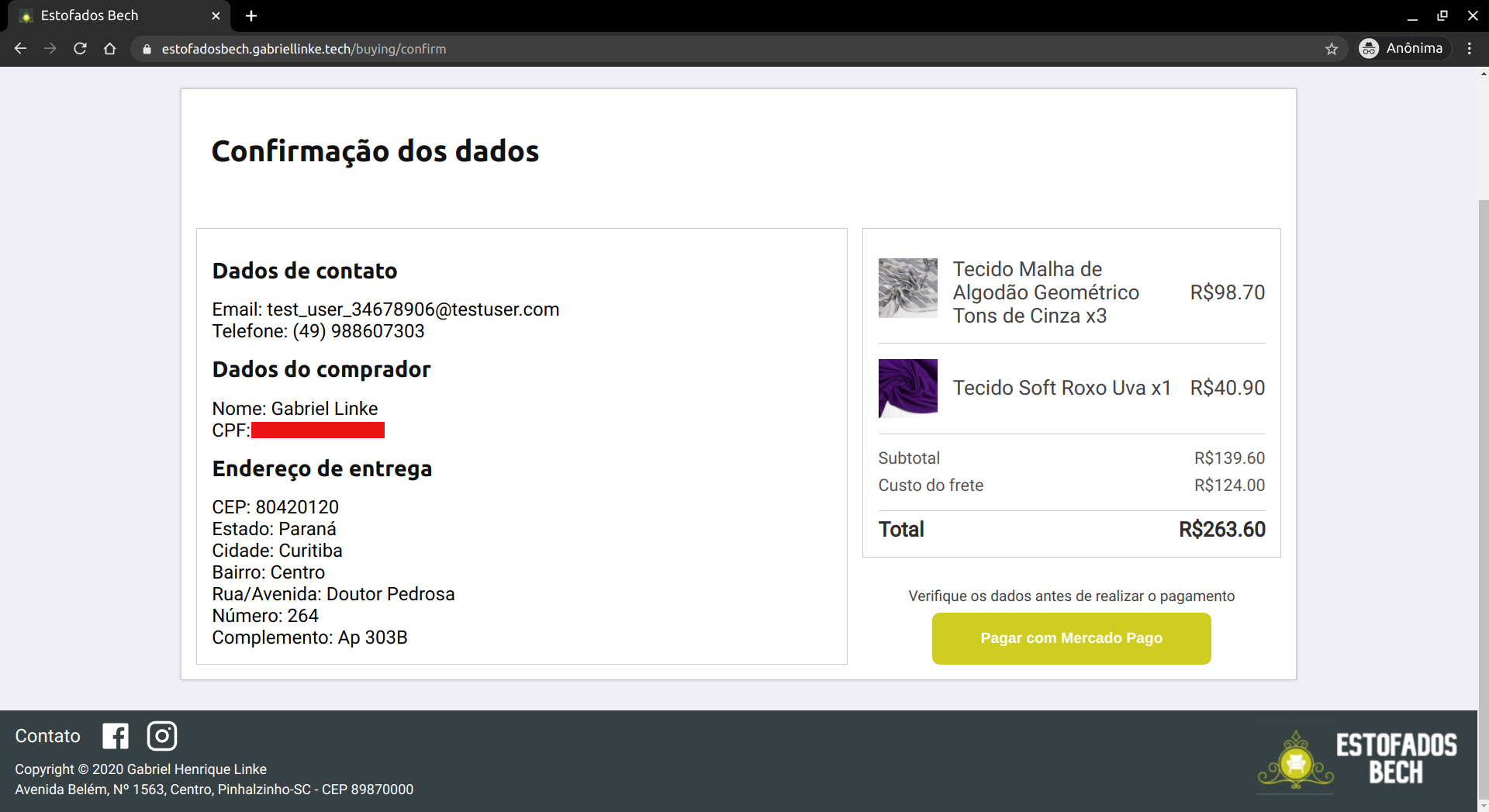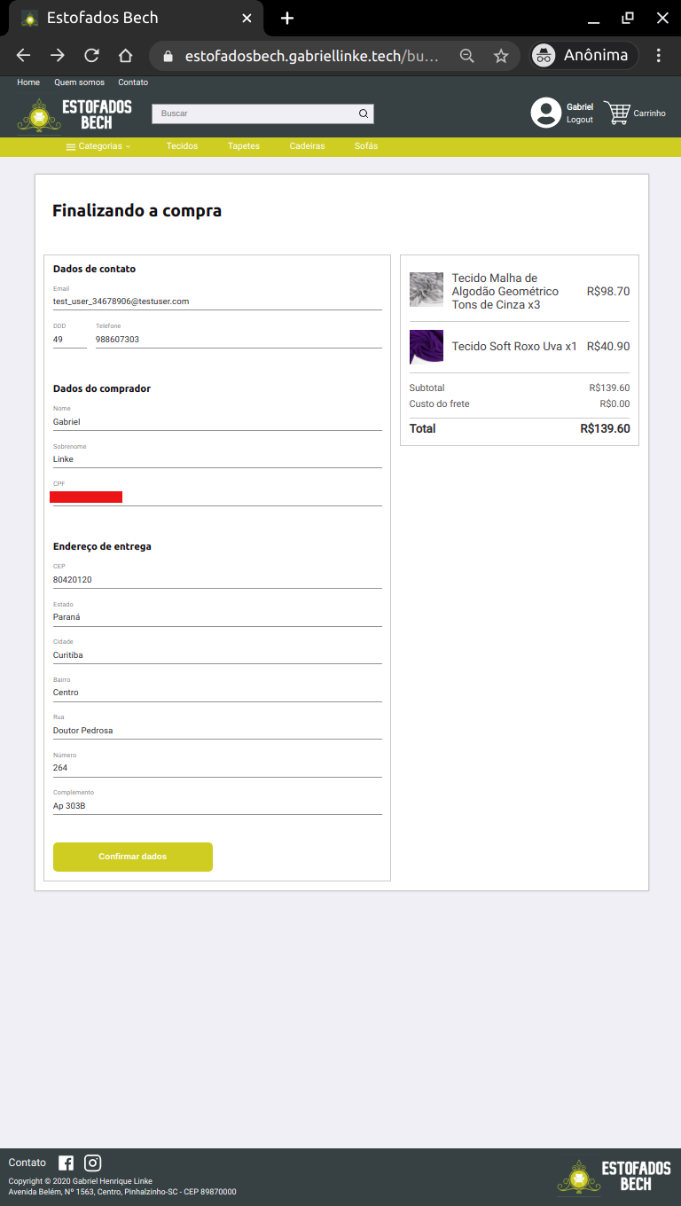 OBS: A compra de produtos no website tem o processamento do pagamento feito através do Mercado Pago, para que assim, o cliente possa ter uma maior segurança no seu pagamento. Atualmente, a conta vinculada para receber os pagamentos é uma conta de testes, dessa forma, para que seja possível simular uma compra, é necessário que o usuário abra o link do Mercado Pago em uma guia anônima ou em um navegador que não tenha nenhuma conta do Mercado Livre logada. Além disso, o email utilizado no formulário deve ser o email de uma conta de testes. Tente utilizar este email: [email protected]. Se houver algum problema, contate o desenvolvedor.