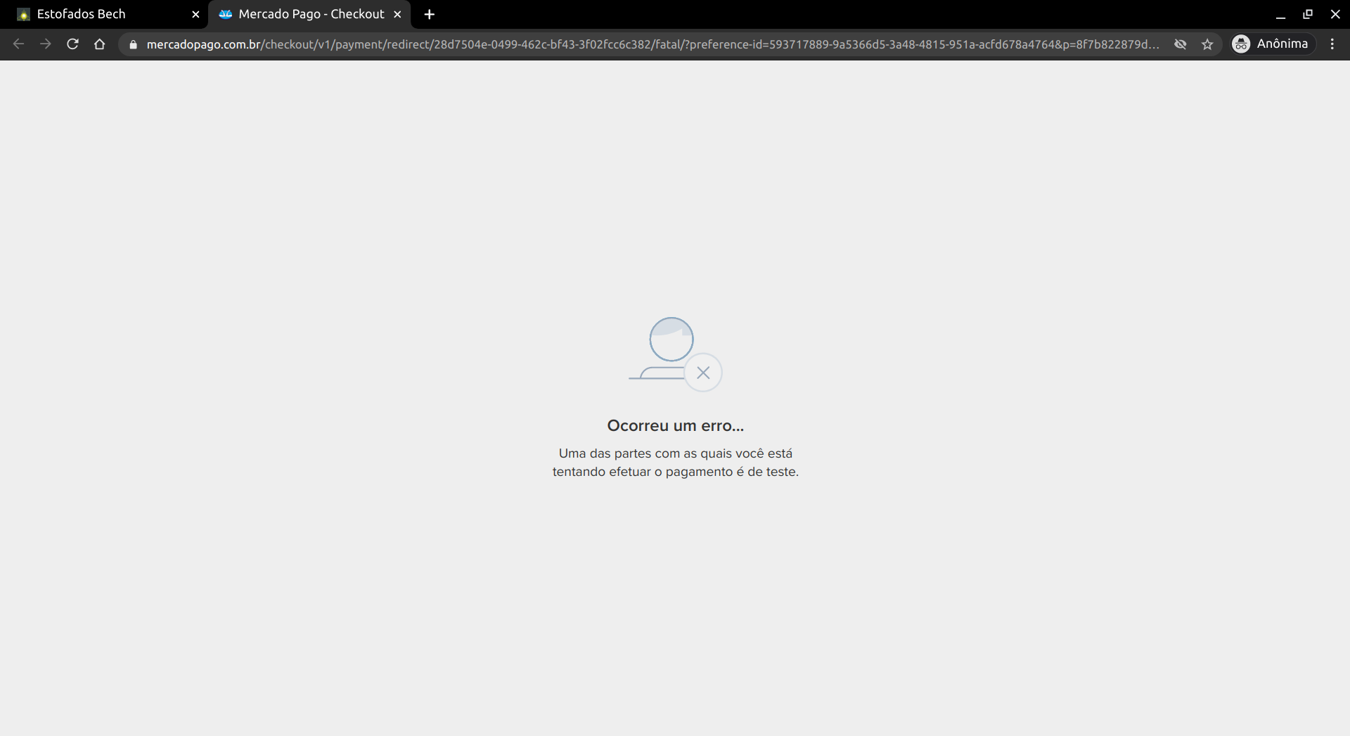 Ao clicar em "Pagar com Mercado Pago" o usuário é redirecionado para a página de pagamento do Mercado Pago. Nela estarão disponíveis diversas formas de pagamento. Também é possível que o usuário esteja em um navegador com uma conta do Mercado Livre logada ou tenha completado o formulário com uma conta que não é de testes. Nesse caso, aparecerá uma mensagem de erro, pois a conta vinculada ao Mercado Pago é uma conta de testes.