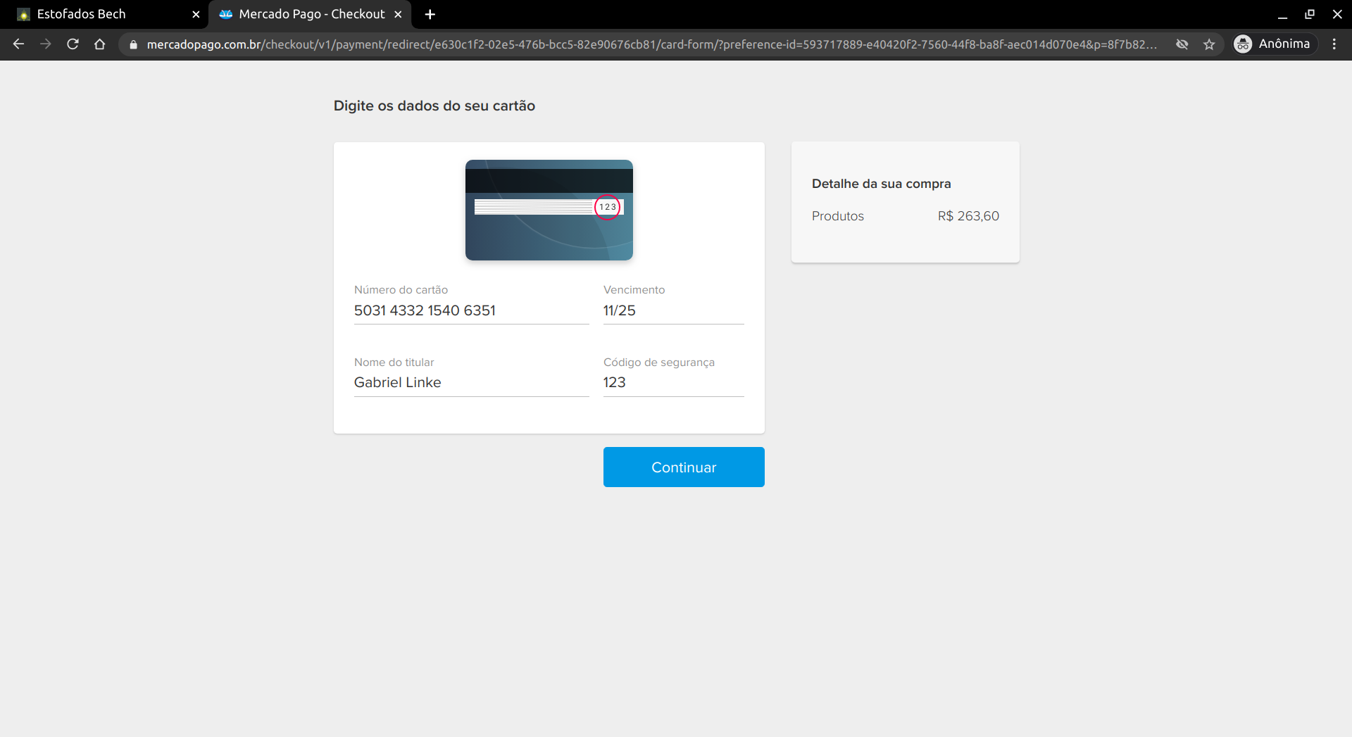 Após selecionar o cartão como método de pagamento, preencha as informações com um cartão de teste. Após isso, continue o preenchimento dos formulários, confirme os dados e faça o pagamento