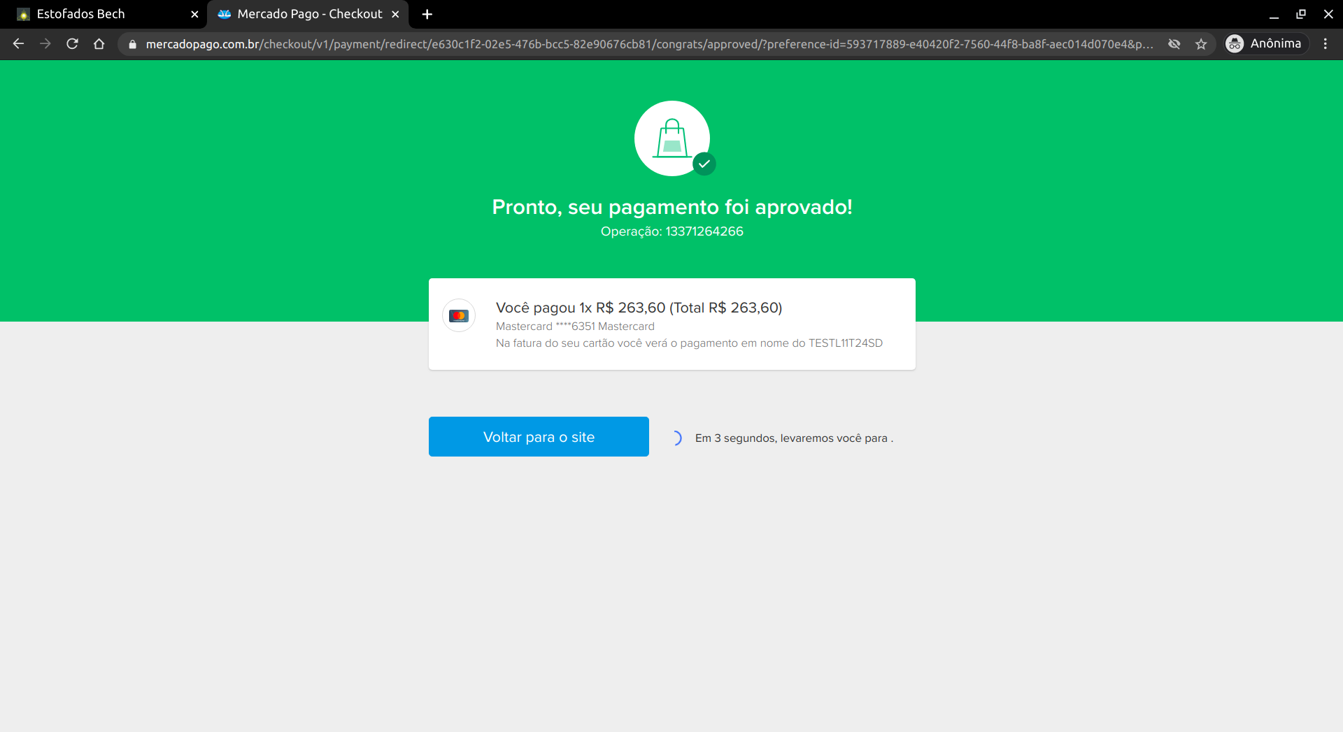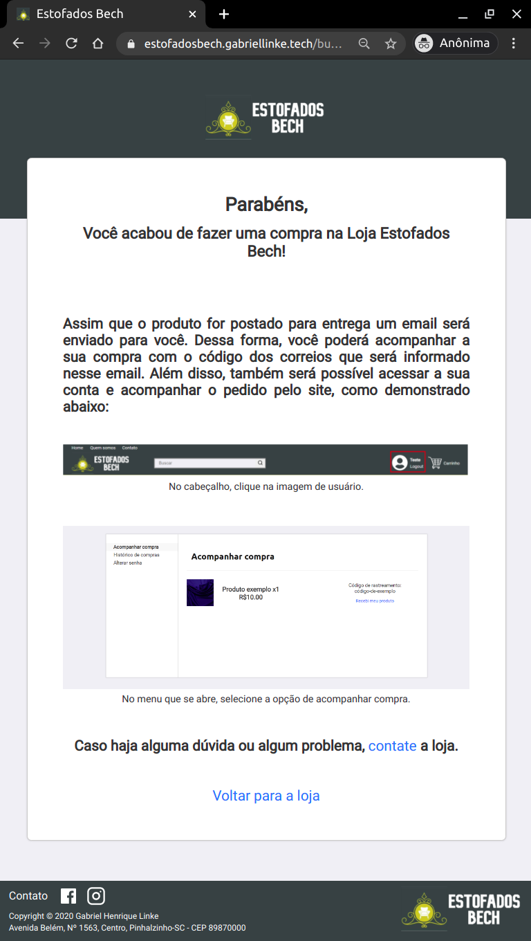 Em alguns instantes o pagamento é aprovado e após alguns segundos o usuário é redirecionado de volta para o site da Estofados Bech. Após voltar para o site, há uma explicação de como o usuário poderá acompanhar a sua compra pelo site.