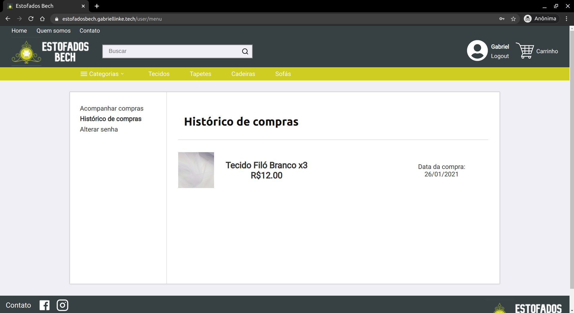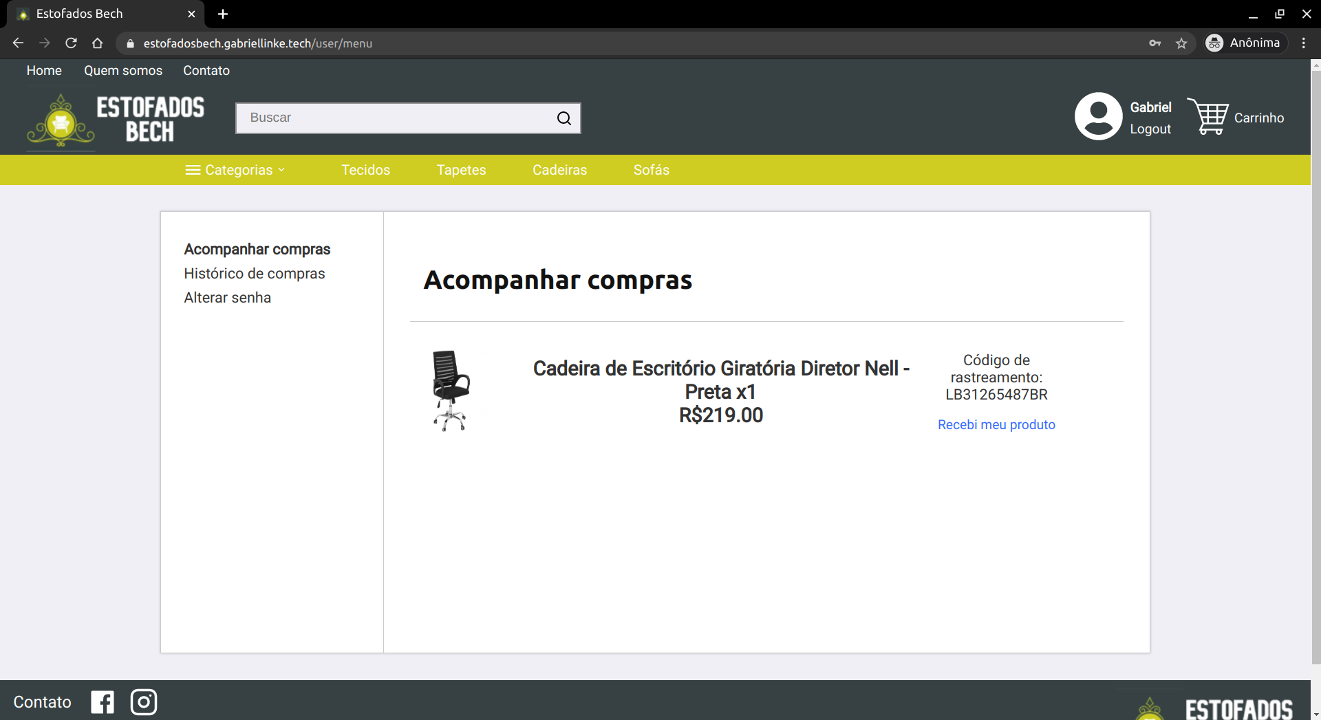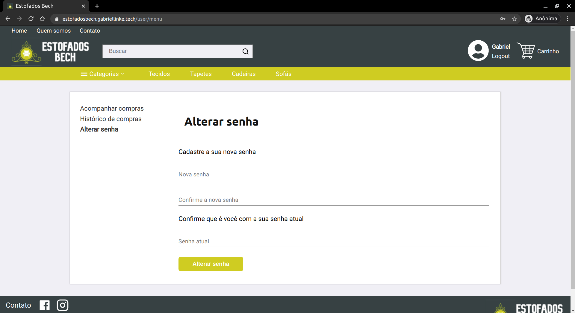 Ao abrir o menu, o usuário tem três opções para navegar: a primeira delas é a de Acompanhar compras, onde o usuário pode verificar suas últimas compras e obter o código de rastreamento dos correios. A segunda é o Histórico de compras, onde o usuário pode observar todas as compras já realizadas no site, bem como a data da compra. A última das opções é a de Alterar senha, onde a única informação necessária para realizar a alteração é a senha atual.