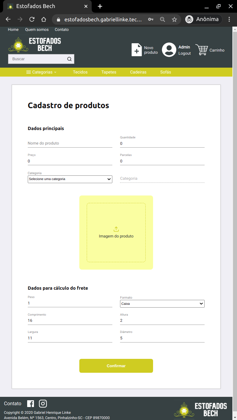 Ao logar no site com uma conta de administrador, novas funções são liberadas. A primeira delas é a de cadastrar produtos. Para isso, o administrador precisa clicar no ícone de "Novo produto" presente no cabeçalho. Então, ele será redirecionado para a página de cadastro do produto. Nessa página, é necessário preencher os principais dados do produto, como o nome o valor e a quantidade, adicionar uma foto do produto, além de ter que inserir as dimensões do produto, para que assim seja possível fazer o cálculo do frete.