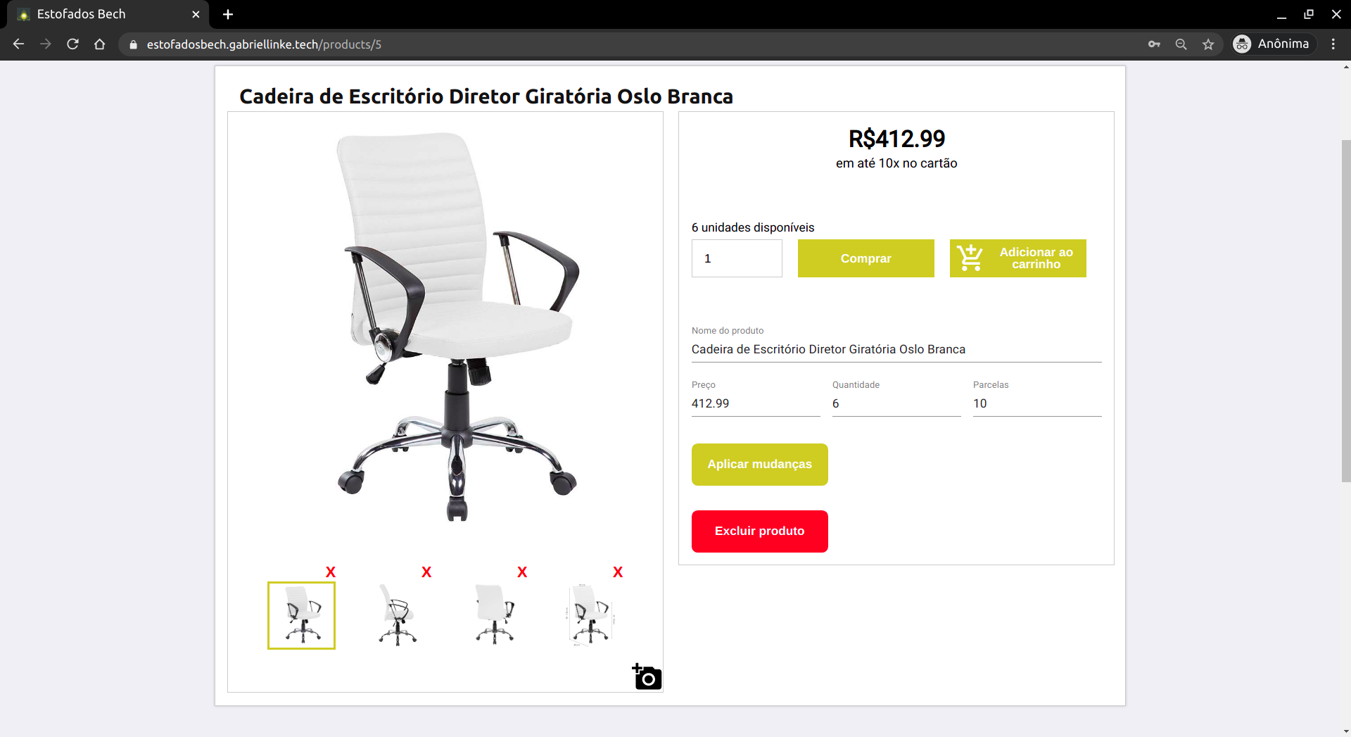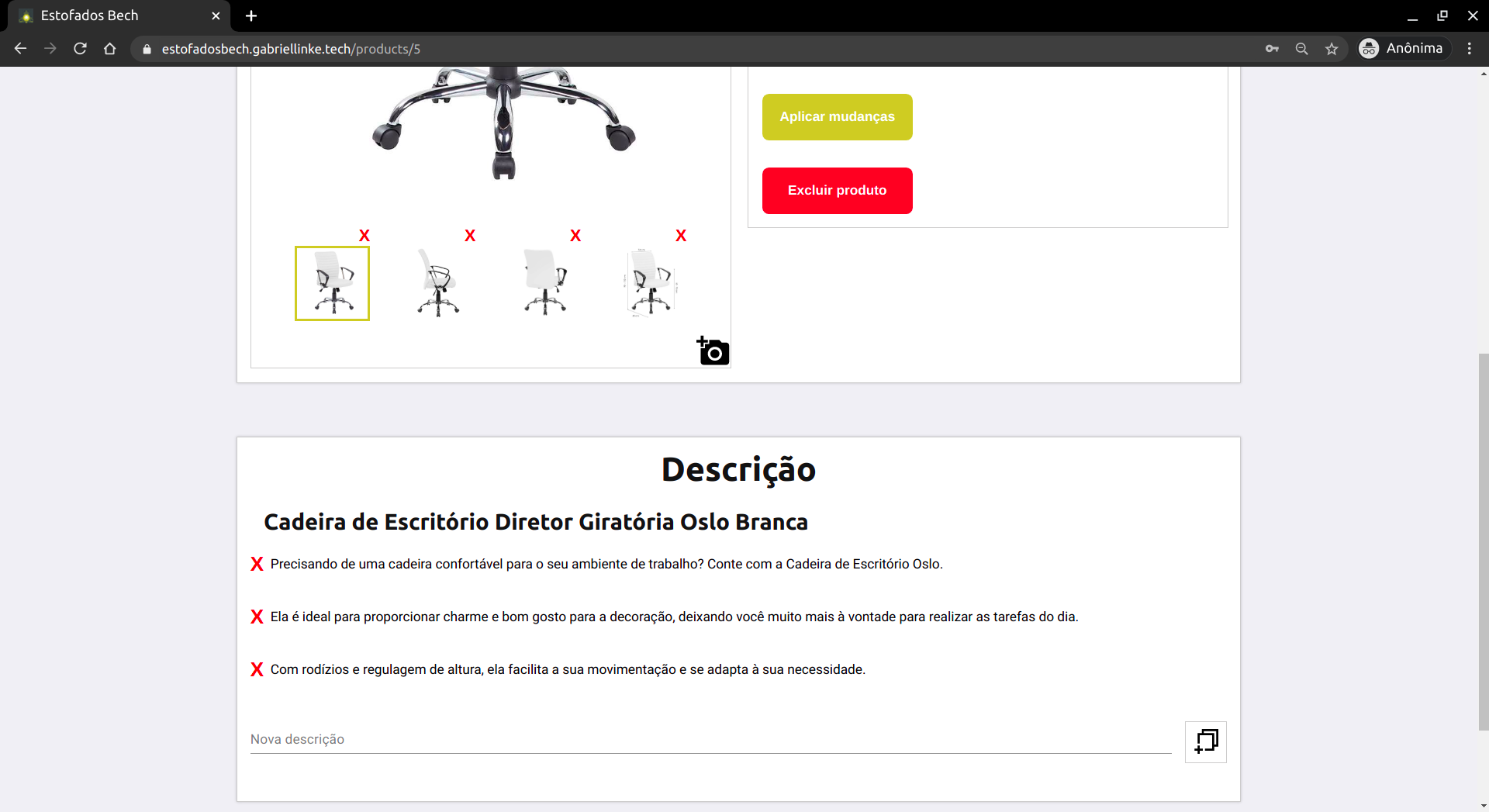 Além disso, também é possível alterar as informações de um produto já cadastrado. Para isso, basta clicar sobre o produto que se deseja alterar. Então, na página que se abre, é possível adicionar e remover fotos do produto, adicionar e remover descrições, alterar o nome, preço, quantidade disponível e quantidade de parcelas permitidas no cartão. Também há a possibilidade de excluir o produto.