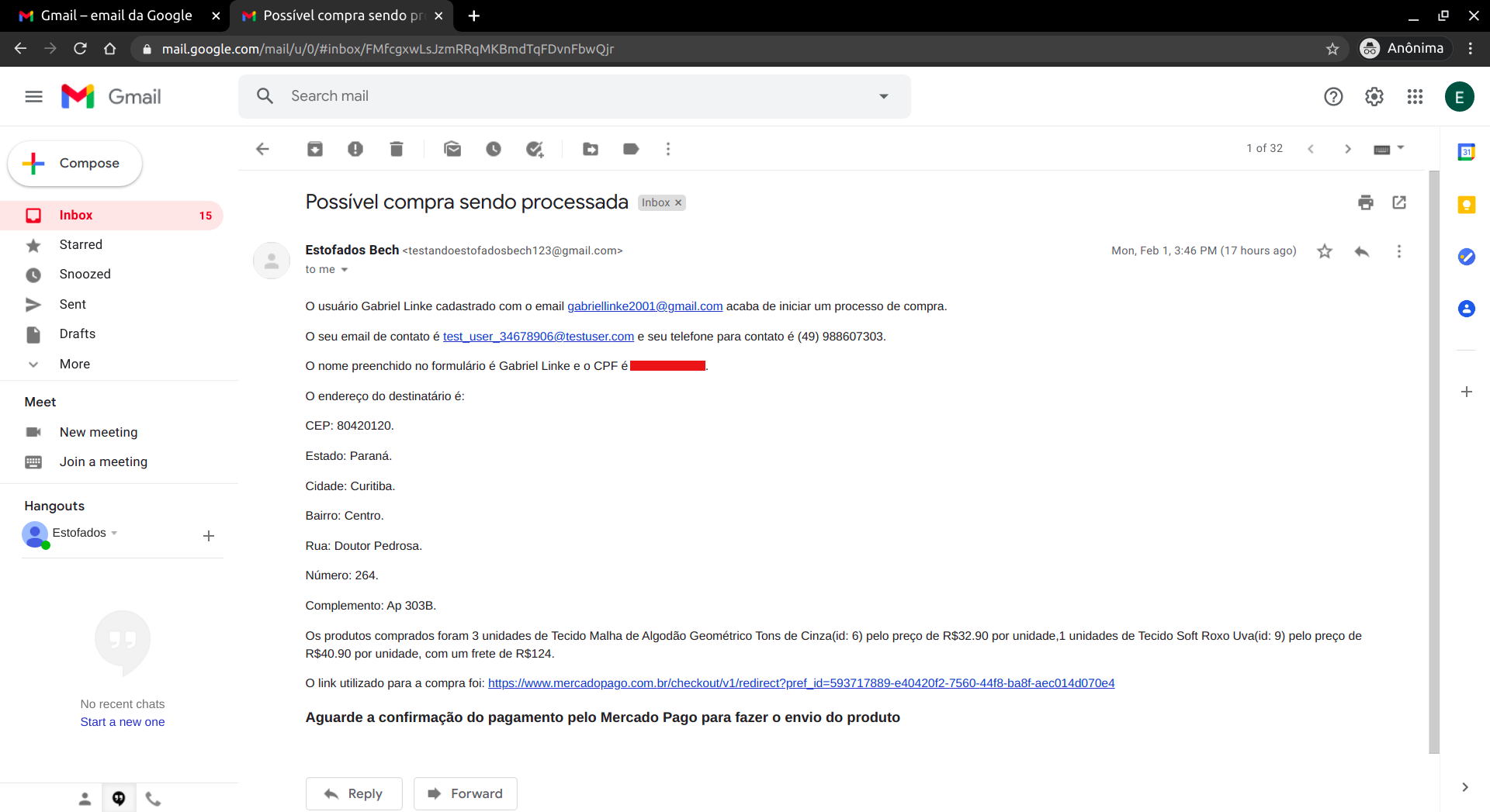 Quando um usuário concluir uma compra, um email será recebido. Esse email engloba as informações do comprador, além de conter o endereço onde o produto deve ser entregue. É importante salientar que, antes de enviar o produto, é necessário verificar a compra no Mercado Pago, pois pode ser que o pagamento ainda não tenha sido aprovado.