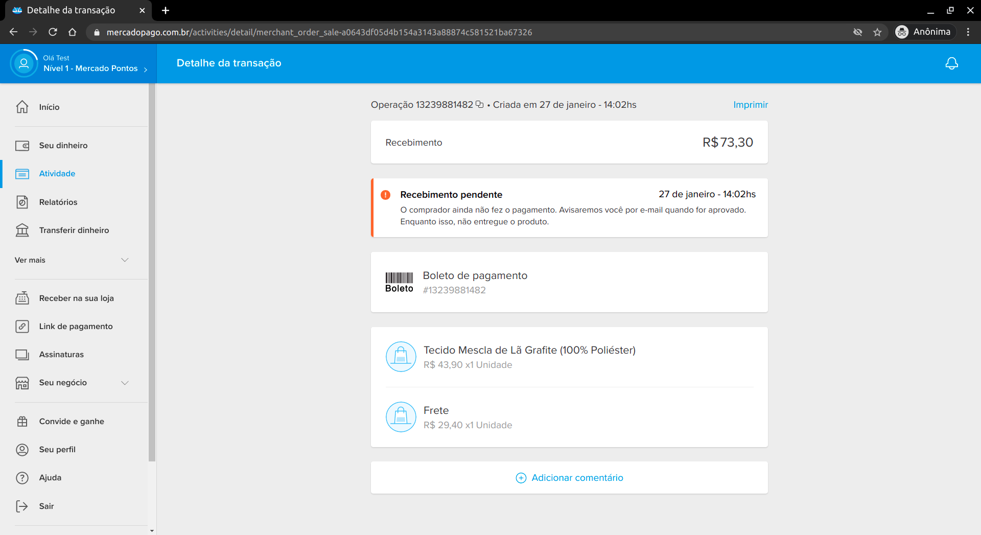Figura 39: Detalhes de um pedido com pagamento pendente.