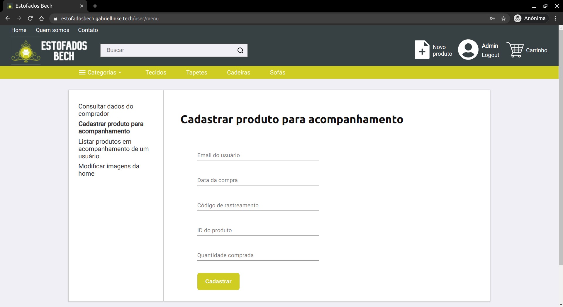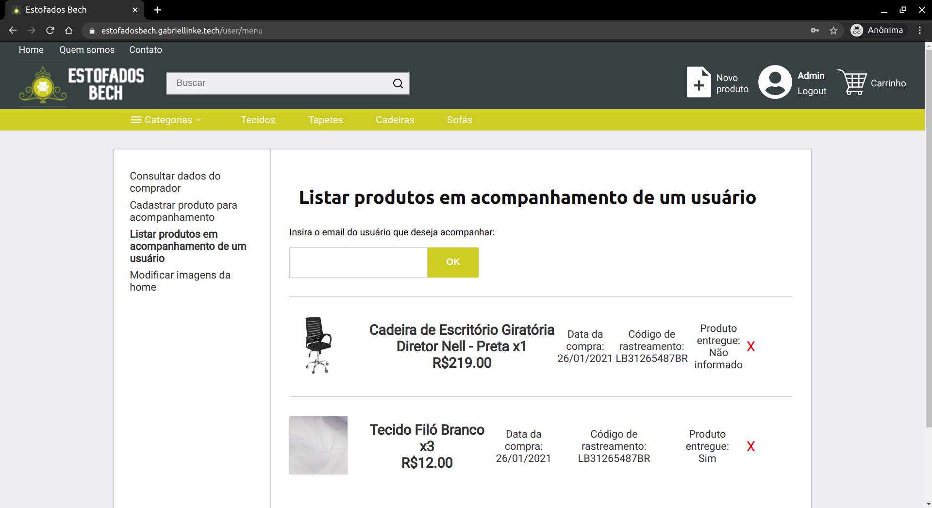 O próximo passo é informar o comprador que os objetos estão a caminho. Para isso, o administrador deve enviar um email para o endereço de email que o usuário deixou como contato, informando que a compra está a caminho e deixando a disposição o código de rastreamento. Além disso, é necessário cadastrar a compra no website, para que o usuário também possa ter acesso a esses dados através do site. Para realizar essa ação, o administrador precisa clicar no ícone para abrir o menu do usuário. Então, ele deve dirigir-se à aba de "Cadastrar produto para acompanhamento". Uma vez nessa página, ele cadastra os produtos usando o email da conta do usuário, a data da compra, o código de rastreamento, o id do produto e a quantidade comprada (todos esses dados estão presentes no email da compra). Nesse mesmo menu também é possível "Listar produtos em acompanhamento de um usuário". Para usar essa opção basta inserir o email do usuário, fazendo com que todas as compras realizadas por ele sejam listadas. Se houver algum erro no cadastro, também é possível excluí-lo através desta página. Após isso, o último procedimento a ser feito é acessar as páginas dos produtos vendidos e atualizar o número de produtos disponíveis.
