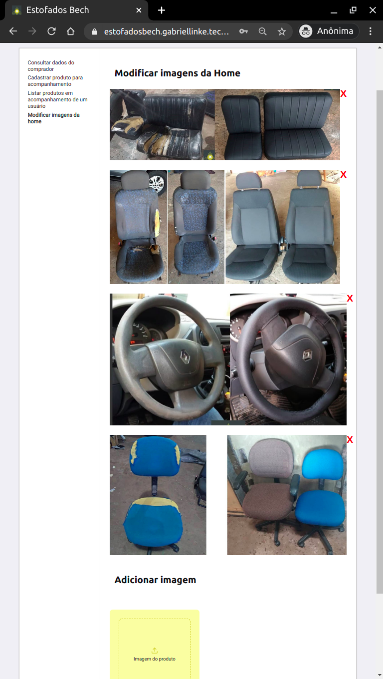 Como última opção do menu está a opção de modificar as imagens da home. Ela é utilizada para adicionar ou remover as imagens das reformas de estofados que são mostradas na home. A opção foi criada para que as imagens possam ser dinâmicas, sendo adicionadas as imagens das novas reformas e removidas as que não são mais pertinentes.
