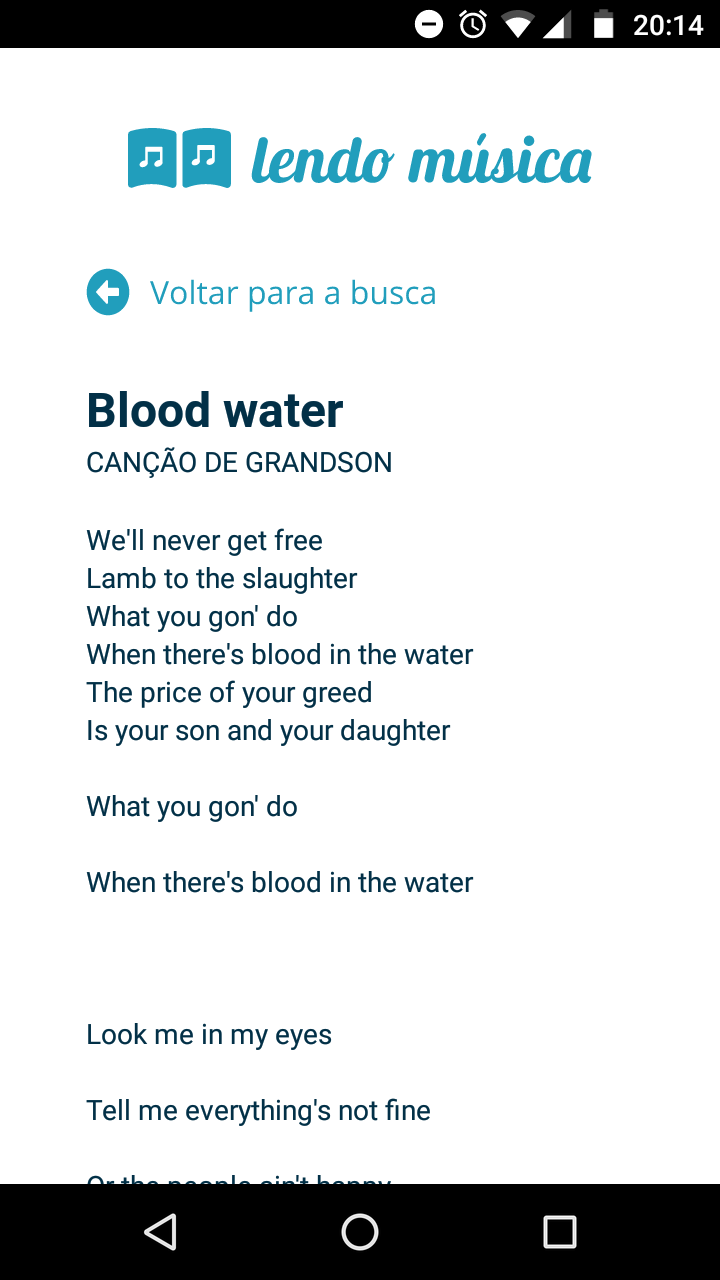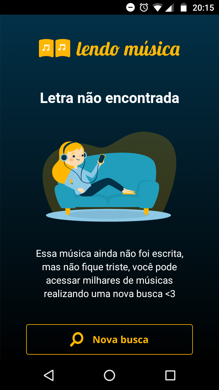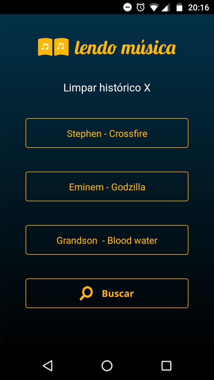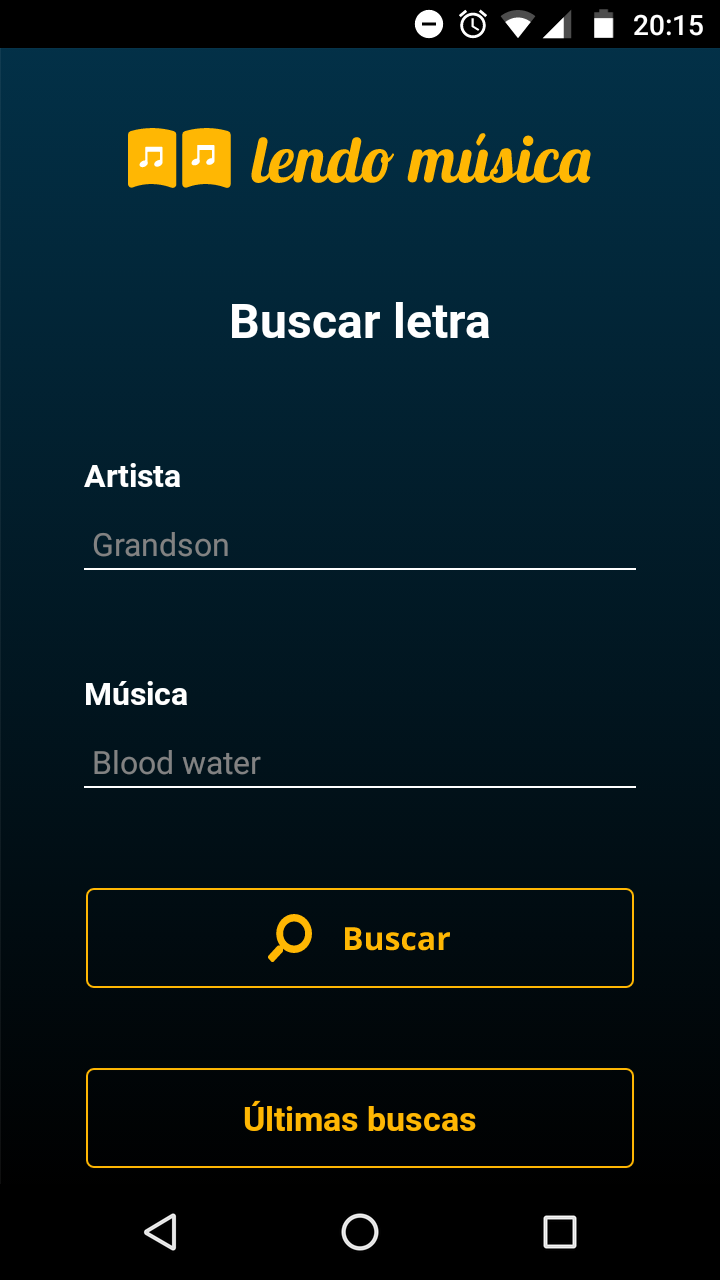 O aplicativo Lendo música é um buscador de letras de músicas desenvolvido para Android. Ao abrir o aplicativo, o usuário se depara com uma tela de buscas, onde ele pode inserir um artista e o nome de uma música e pressionar o botão buscar para pesquisar a letra dessa música. Essa tela também tem o botão de "Últimas buscas" que, ao ser pressionado, direciona o usuário a uma página listando as suas 10 últimas buscas.