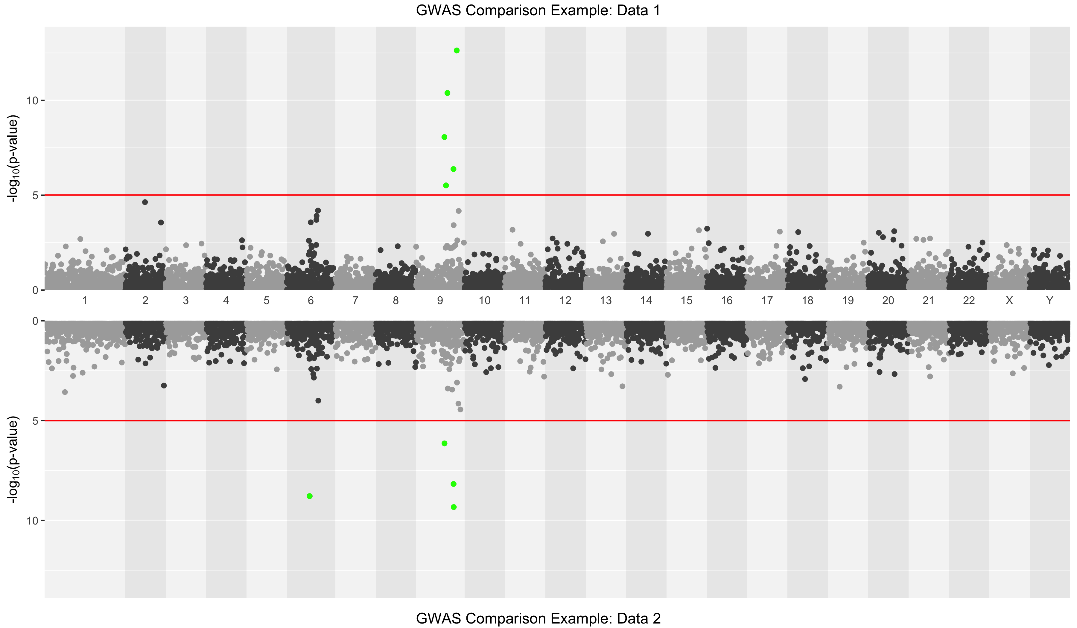 toptitle="GWAS Comparison Example: Data 1", bottomtitle = "GWAS Comparison Example: Data 2",