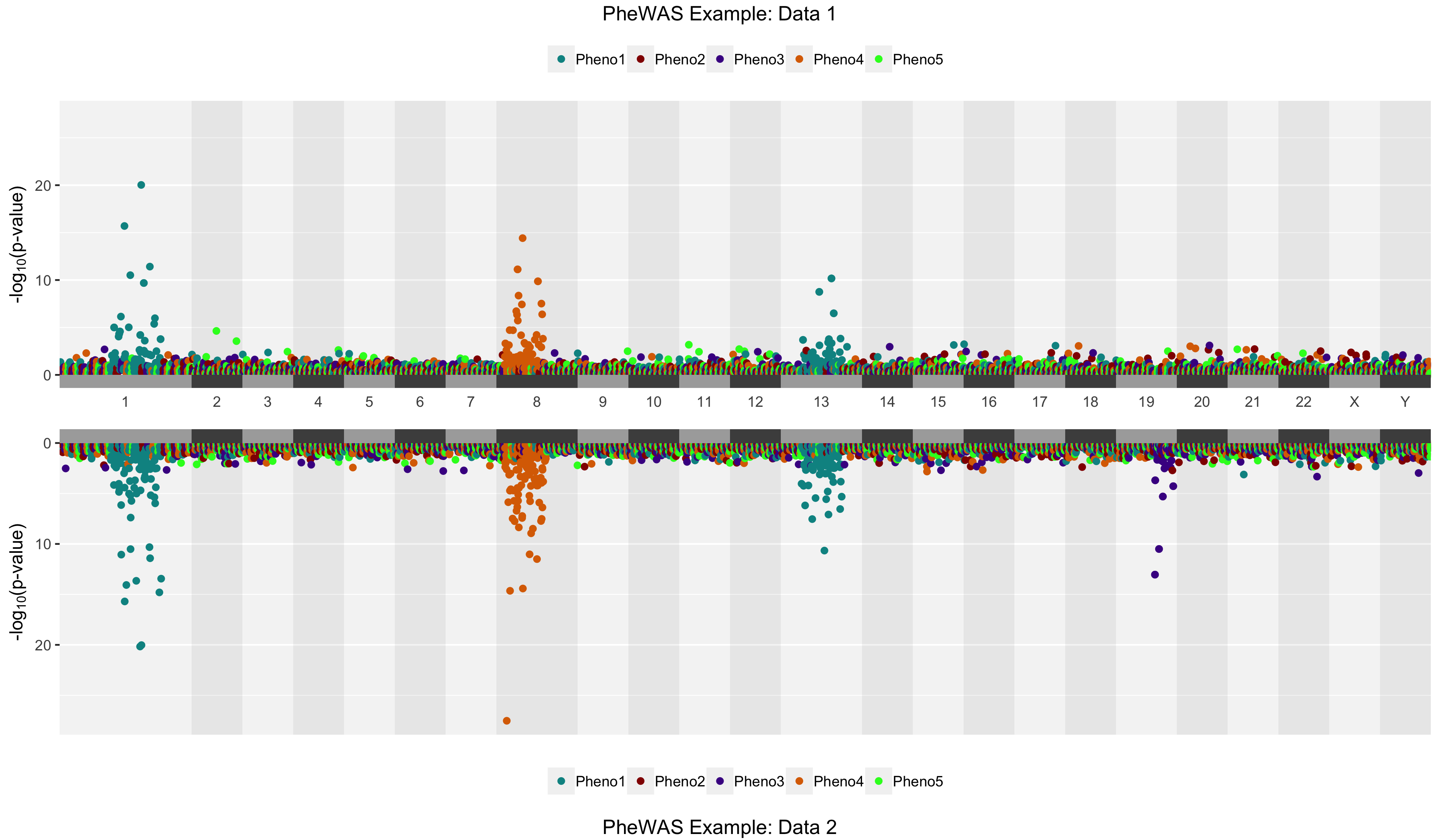 toptitle = "PheWAS Example: Data 1", bottomtitle = "PheWAS Example: Data 2")