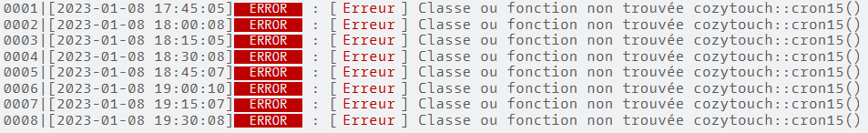 Après installation de la version du 2023-01-05 01:21:24, les logs CRON remontent l'erreur suivante :  Pas de détail en activant le log du plugin ( ce qui semble normal vu le message ) Version JEEDOM 4.3.12