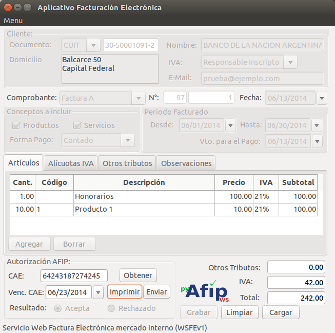 - Online autorization of the infoice agains AFIP (Argentina's Federal Tax Agency)