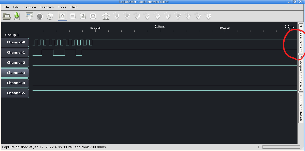 Following two pictures show the issue. See glitch in signal of Channel-0 and 1 at the very last(rightmost).