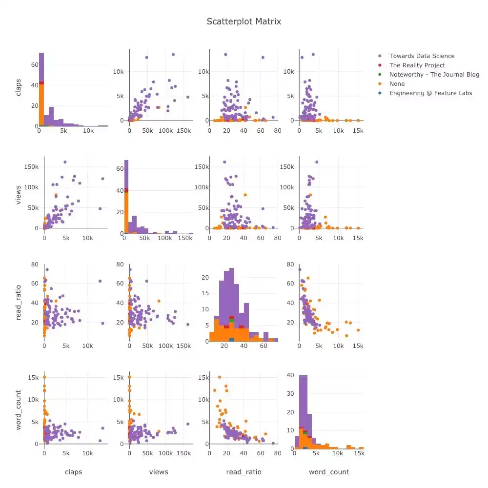 figure = ff.create_scatterplotmatrix(df[['claps', 'publication','views','read_ratio','word_count']],diag='histogram', index='publication')