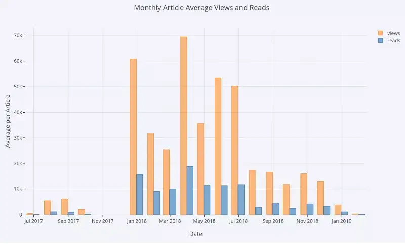 结合 pandas 对数据进行统计处理,我们可以得到很多非常有价值的图,比如下面这张关于不同文章发表渠道的读者点击查看数量的变化趋势图,显然名为Toward Data Science的发表渠道能给文章带来更多的点击量。