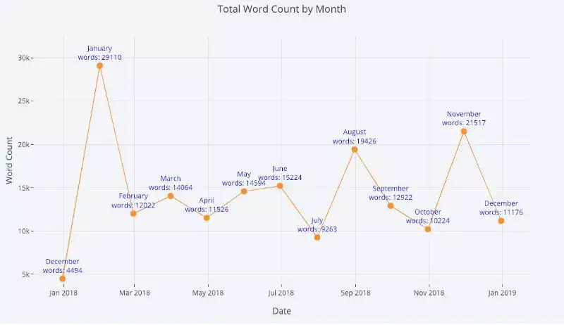 tds_monthly_totals.iplot(mode='lines+markers+text', text=text, y='word_count', opacity=0.8, xTitle='Date', yTitle='Word Count',title='Total Word Count by Month')