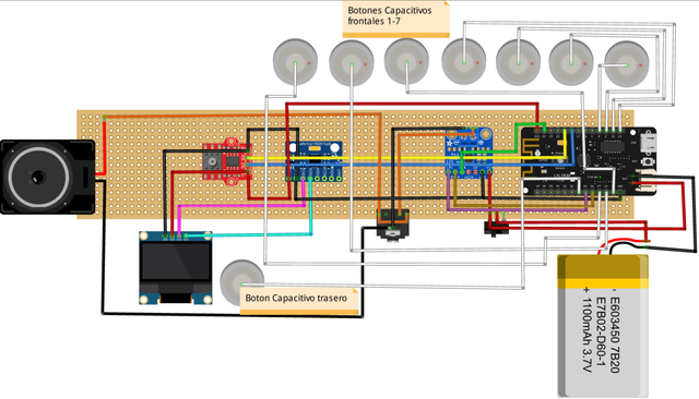 For the connection of components you can use the following diagram as a guide. The perforated bakelite is used as a reference to locate the components on it. The connection of the cables is up to you, I know that you will locate them in the best way.