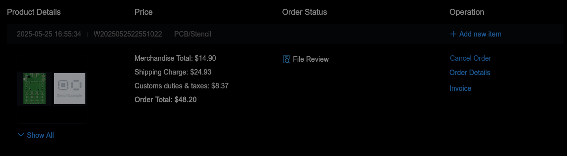 #electronicschannel on Slackonboard/projectsTEMPLATE.mdasREADME.mdinside your project foldergerber.zipandschematic.pdfinside your project foldersrcand uploaded design filescart.pngwith all costs includedFootnotes