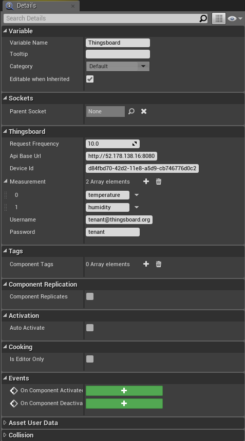 Create a Blueprint Actor and add Thingsboard/Thingworx component. In the component parameters you can change base url, device id,
