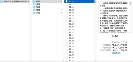 每个分类里面都是一些文本文档。任何满足此格式的语料库都可以直接加载。