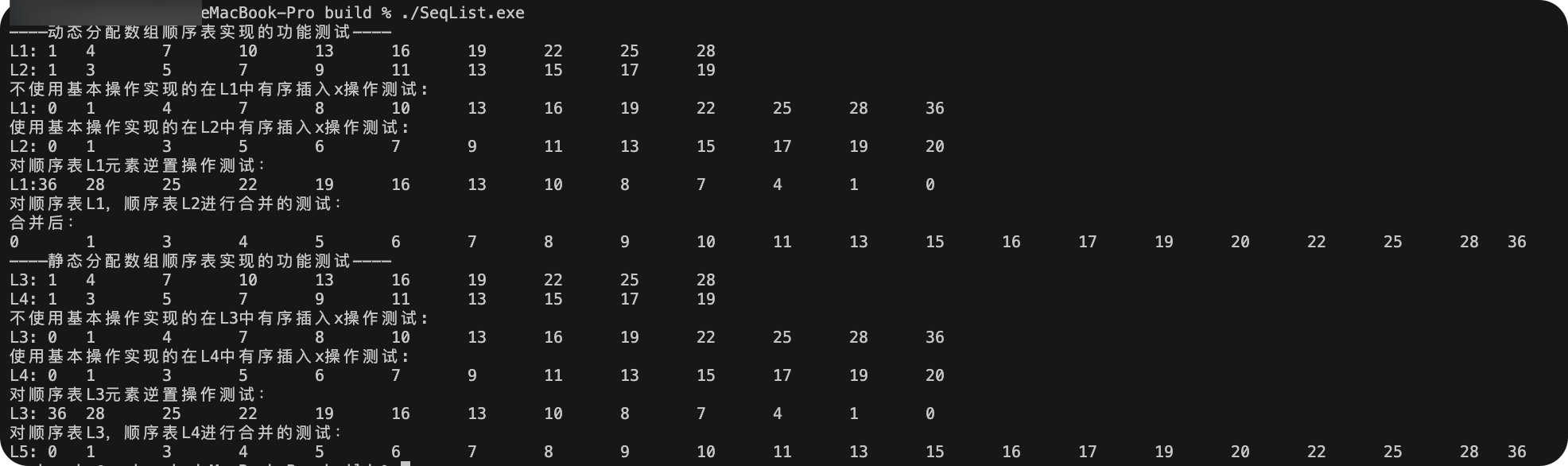 [100%] Built target SeqList.exe4️⃣ 最后运行程序:编译完成后,在 build/ 目录中会生成一个可执行文件,执行运行命令: