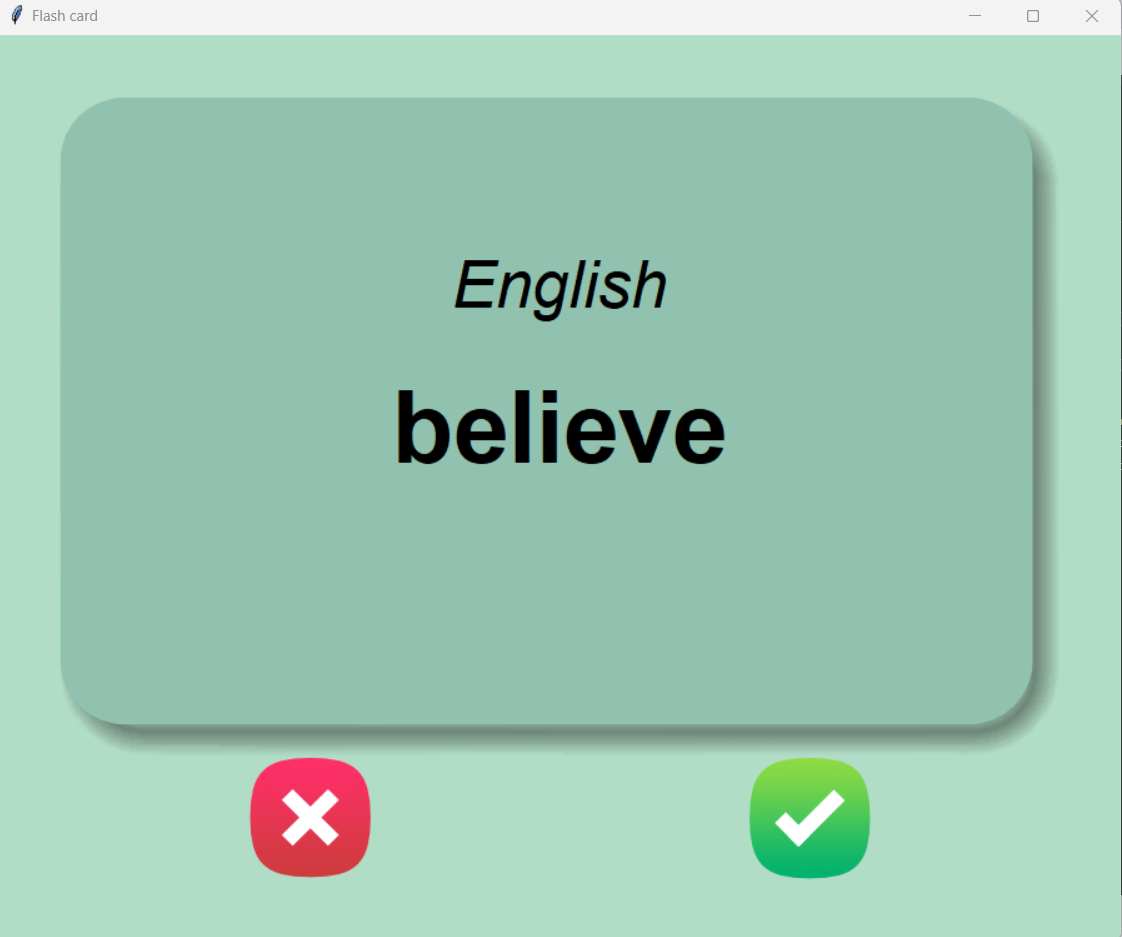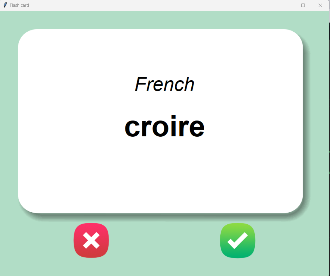 This game can be used by someone learning french words. The concept of the game is that a card containing a word in french is shown to the user, then after 3 seconds the card is flipped and english translation is shown. If the user already knows the word he should click the right(green) button indicating that he knows the word, otherwise he should click the red button which means he's still to learn that word. When the user clicks the right button that word is deleted from the list of the words so that it would never appear again. This way the user can only focus on the words that are he is unfamiliar with.