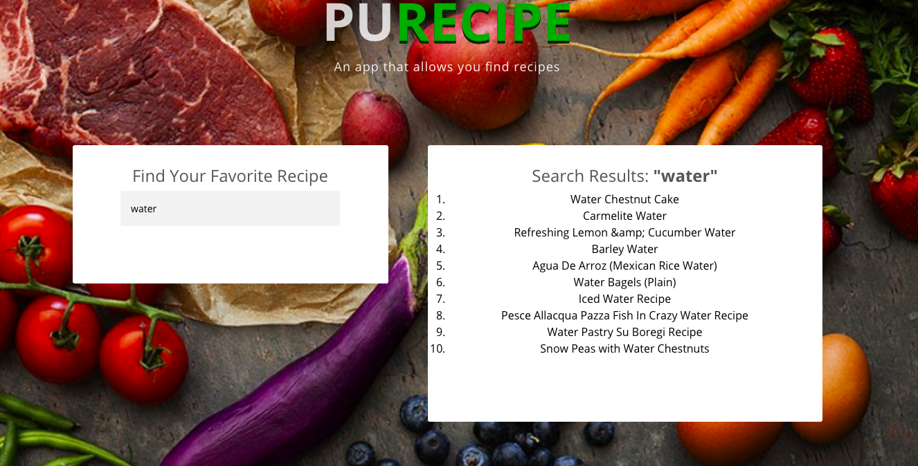 - As the user types in a search query for the name of a recipe, search results should be displayed in a list (i.e. each time the user adds or removes a character to the search term, the list may update).