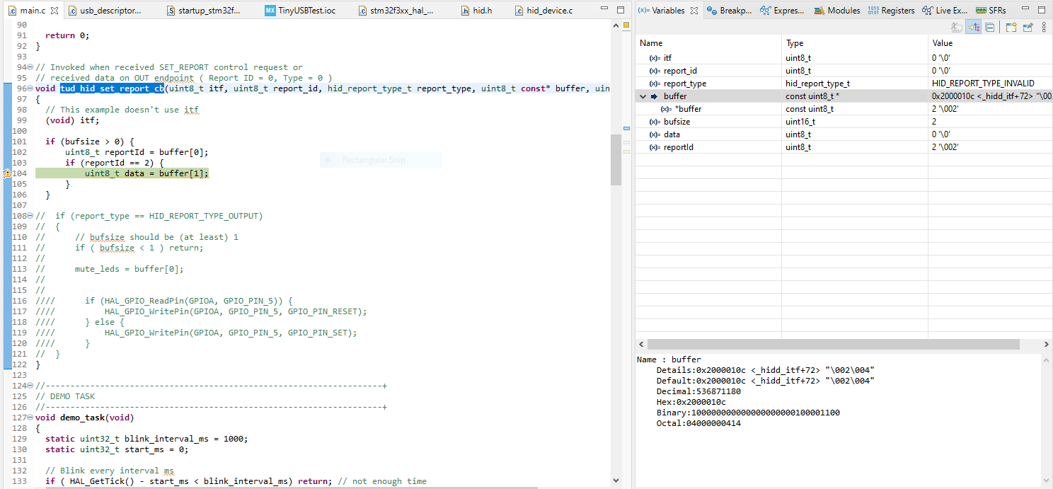 tud_hid_set_report_cbshould be working, when in relation to receiving reports on the OUT endpoint. The callback fires just fine when I send a report from the host. Good. The buffer length is also correct. However when it comes to reading the payload, ie any data after the first byte (reportID), its not there. I just get 0 on the 2nd byte.The report buffer should simply be