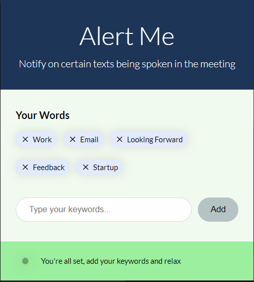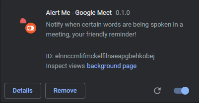 A Chrome Extension that notifies people when certain words are being spoken in a Google Meet Meeting opened in Chrome browser. You can set the alert words yourself with your name or any word you want to be notified for. Use it to your own advantage.