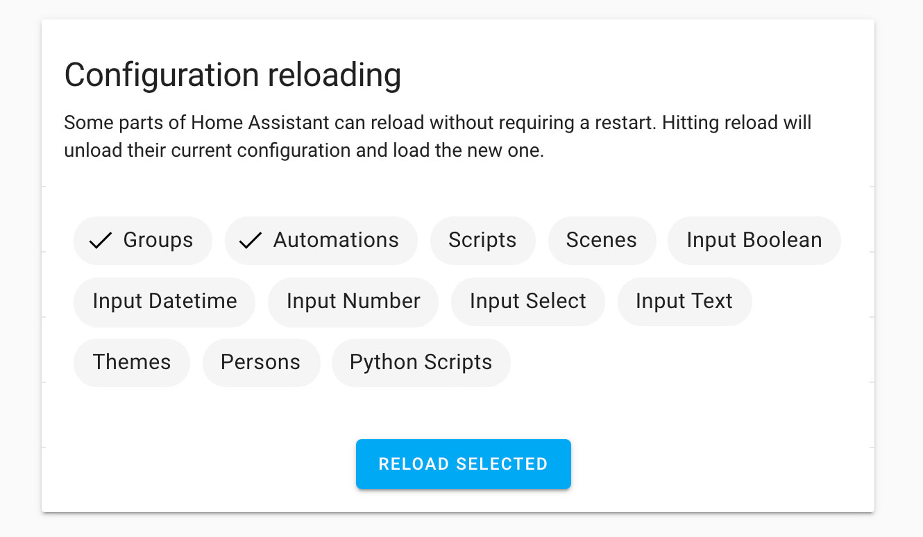 Chips with multi-select would allow adding all of the various services while still keeping the card a reasonable size. Even with everything added, it would be shorter than it currently is. An added benefit is that you can reload multiple things at once. So if you make a brand new automation that has an input boolean you could do them both at the same time.