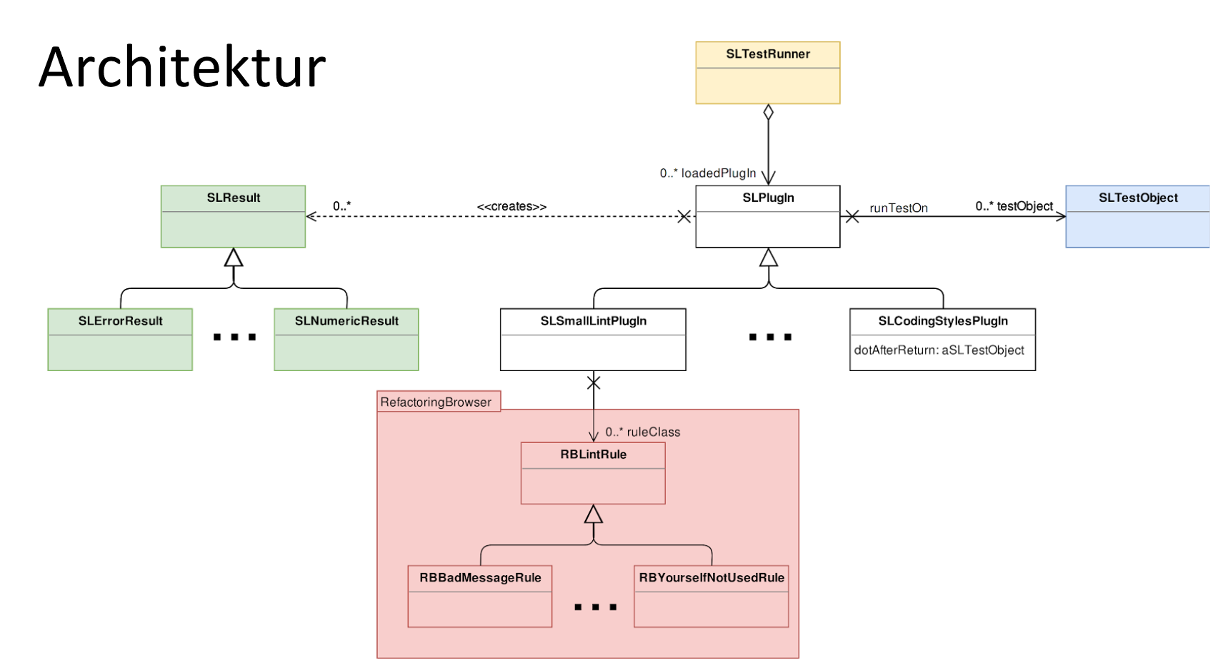 One special PlugIn is the SLSmallLintPlugIn, since it gets all of its logic from the outside, the RB (RefactoringBrowser) package. So the SLSmallLintPlugIn class just redirects a call to a specific linter rule to the corresponding RB-class, e.g. RBPrecedenceRule (naming is alway RB as prefix, then the actual name followed by Rule as postfix).