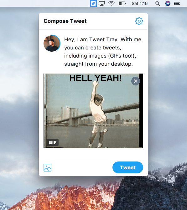 Tweet Tray is a small application which allows you to tweet from your desktop system tray or status bar, without any further distractions. The core technology used consists of Electron, React + Redux and Styled Components. All transpiled from ES6 Javascript.