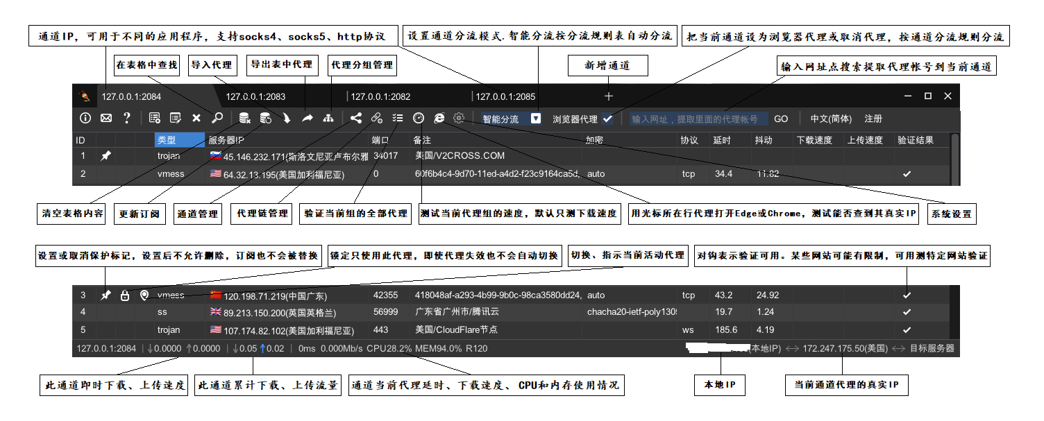 1. One software runs multiple proxy channels at the same time, and each channel uses its own proxy pool and subscription. A channel is a proxy terminal, such as the browser uses channel A, application (or device) 1 uses channel B, application (or device) 2 uses channel C...2. Quick batch verification of proxy. Supports socks4, socks4a, socks5, http, https, vless, vmess, hysteria, hysteria2, tuic, trojan, shadowsocks, shadowsocksR and other protocols.
