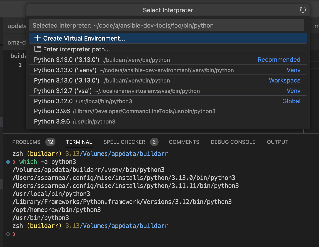 Please remark that while the .venv is detected, the two mise installed pythons are not suggested by vscode when it comes to selecting a python interpreter, even if they are in PATH. This is an issue especially for projects that do not use a