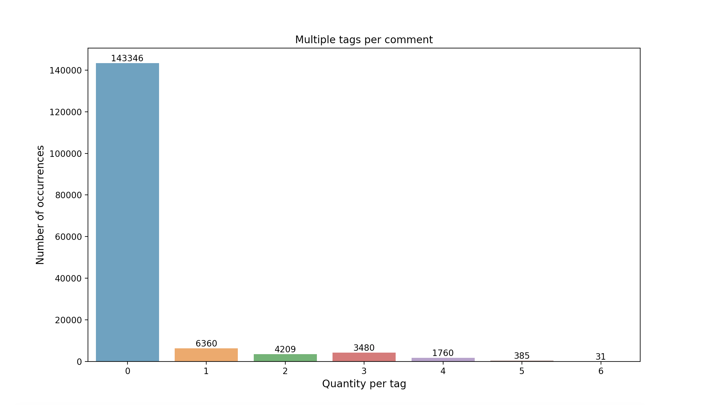 plt.show()As we can see, if we sum up the number on top of each of the bars, it will exceed the total number of comments. Therefore, there must be cases where a comment is classified as severe_toxic AND threat, say.