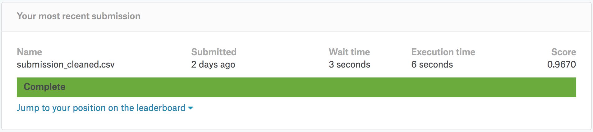 Since this was a part of Kaggle Toxic Comment Classification Challenge, I submitted the results to Kaggle, and our model got the following score: