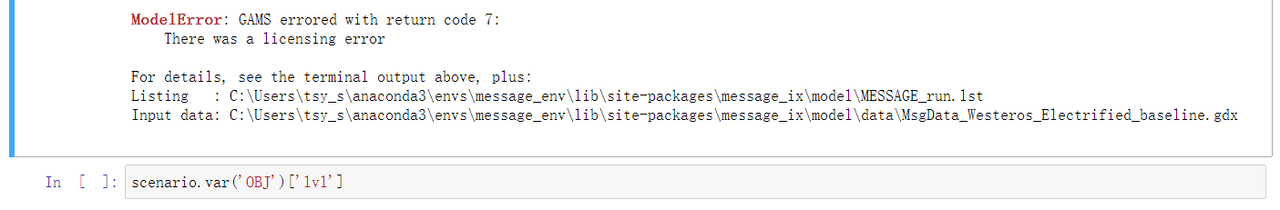 Thanks @Samtsy1 for reaching out. As your error messages shows, there is a problem with your GAMS license. Please be aware that new versions of GAMS don't support a free license even for small problems. For more information, you may refer to MESSAGEix installation notes on this, consult with your colleagues on what type of license you are using in your institution, or you can request a free demo license from GAMS. |