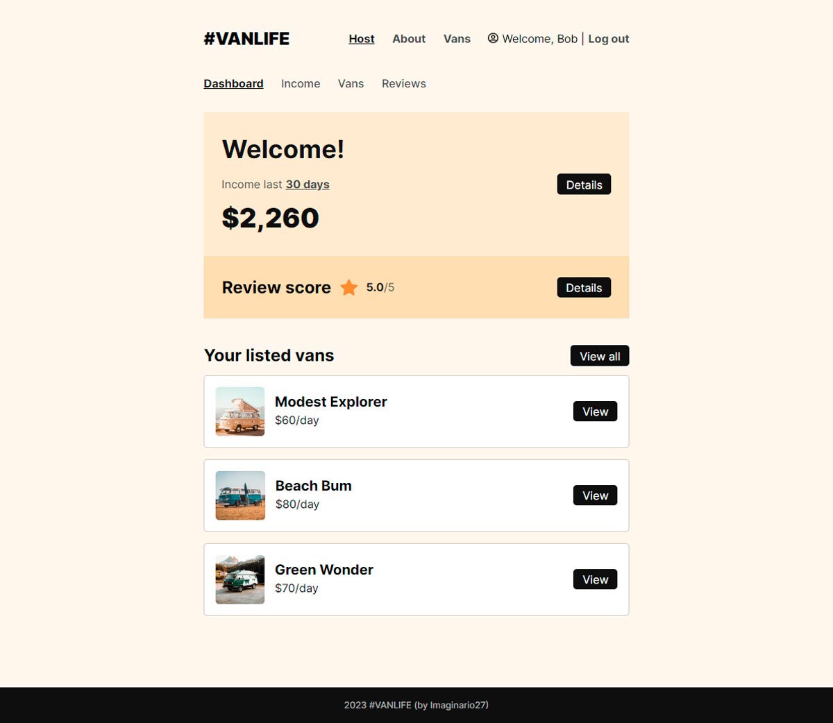 - Inside the host page there are some subpages such as dashboard, incomes, hosts vans and reviews.