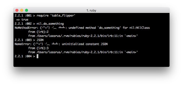 NoMethodError: (╯°□°)╯︵ ┻━┻ : undefined method `do_something' for nil:NilClass- Fork it ( https://github.com/iridakos/table_flipper/fork )