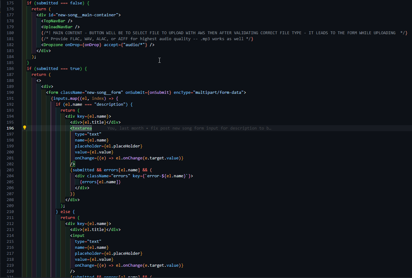 Image Below is a drag and drop implementation using 'DropZone' package and it also includes having two returns within one form with a transition depending on the state of submitting a song. If a valid song is submitted it will upload the song as it displays you the song details form to fill out it's title, genre, description, etc...