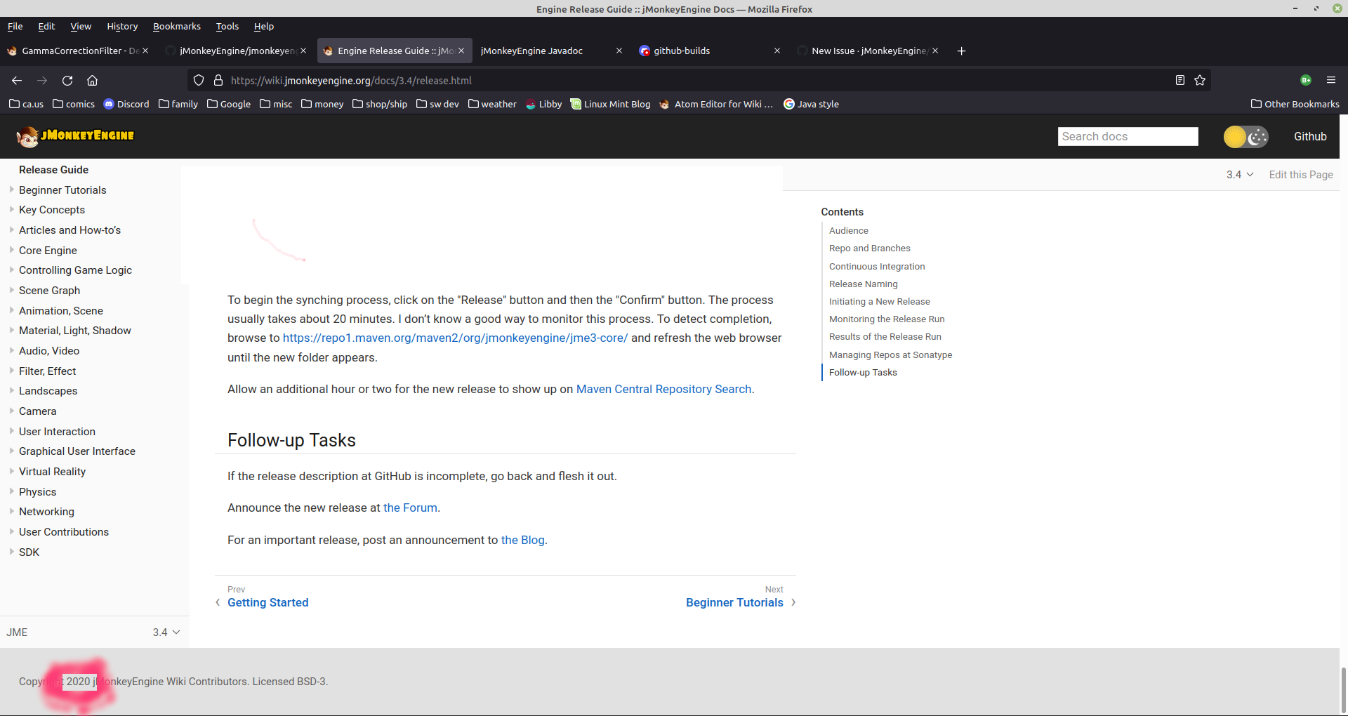 The wiki footer still says "Copyright 2020 jMonkeyEngine Wiki Contributors."