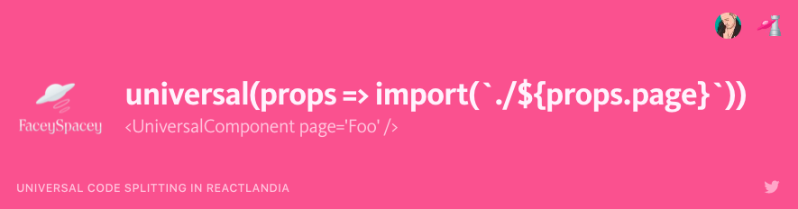 And maybe even cooler to some: you don't have to do universal(() => import()). I.e. you don't have to wrap it in a function any longer when using react-universal-component, similar to dynamic(import()) in Next.js...unless of course you're making use of the extremely useful props argument.