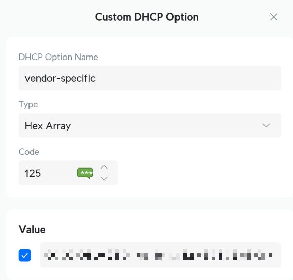 - Custom DHCP Options : Ajouter une option "vendor spécific" (code 125) avec une chaine hexadécimale de la forme :